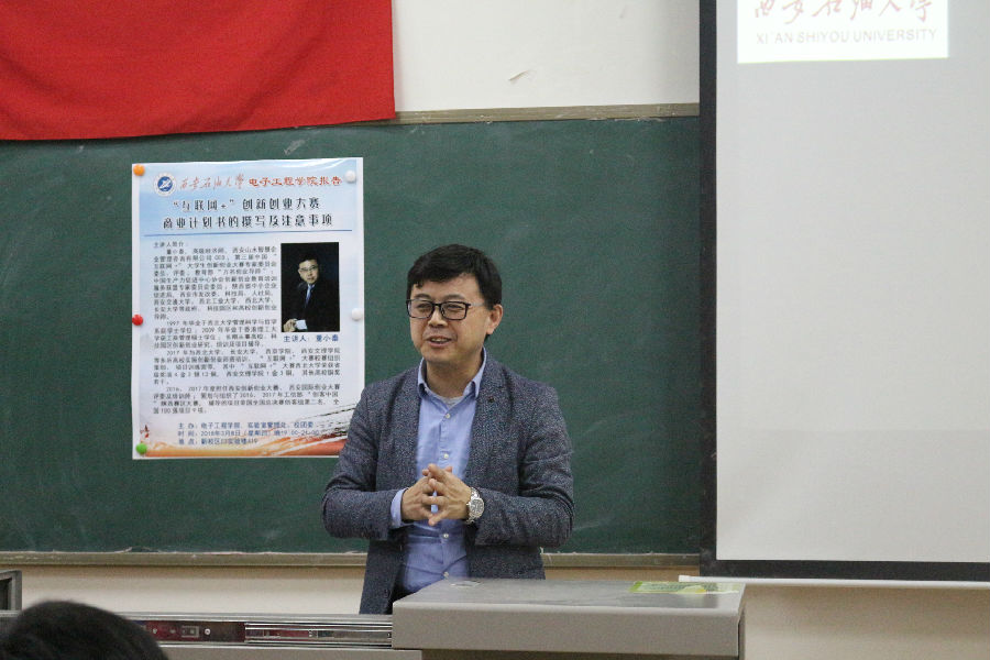 3月8日晚19點,電子工程學院在鄠邑校區(qū)C3實驗樓419教室成功舉辦了題為《商業(yè)計劃書的撰寫及注意事項》的專題講座。此次講座邀請到高級經(jīng)濟師、山水智慧企業(yè)管理咨詢有限公司CEO董小泰老師擔任主講。電子工程學院黨委副書記黃建禮、2016級輔導(dǎo)員梁琦、青年教師顏謹?shù)戎笇?dǎo)老師以及申報“互聯(lián)網(wǎng)+”創(chuàng)新創(chuàng)業(yè)項目的同學參加此次專題講座。