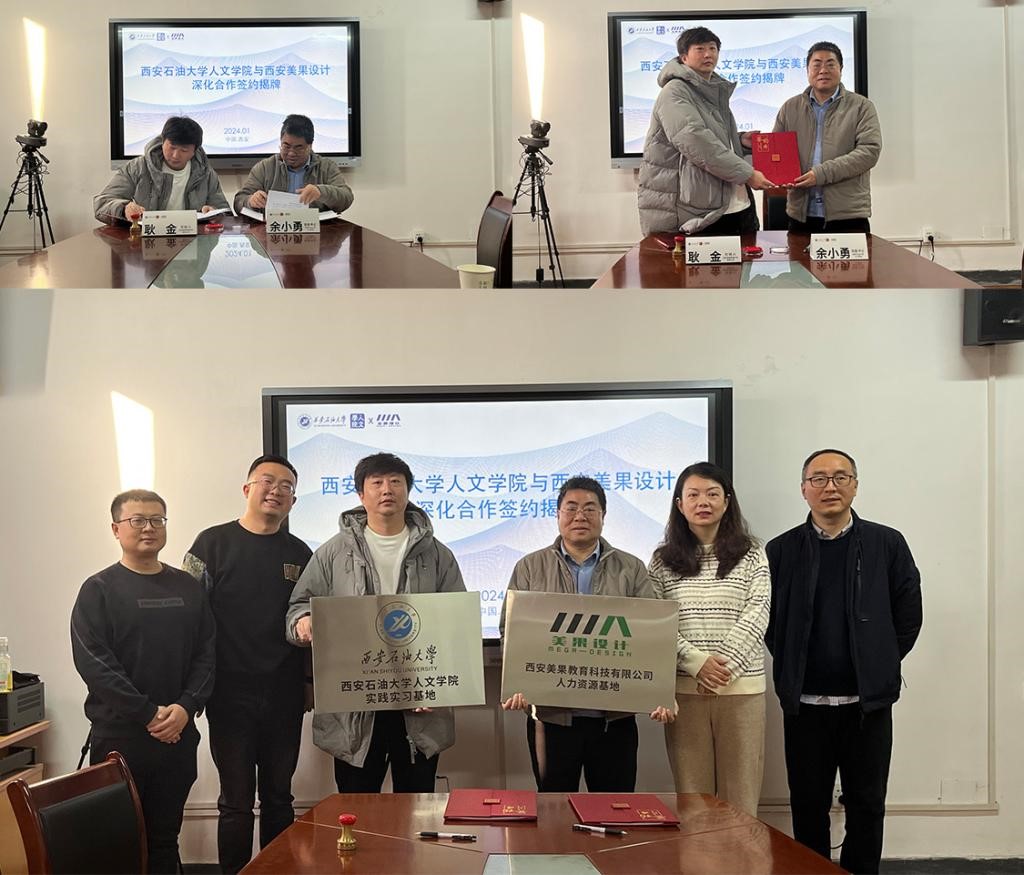1月11日上午,人文學(xué)院與西安美果設(shè)計(jì)三年多來(lái)基于優(yōu)質(zhì)且有成效的合作,在西安石油大學(xué)雁塔校區(qū)一號(hào)教學(xué)樓813人文學(xué)院會(huì)議室,舉行了人文學(xué)院與西安美果設(shè)計(jì)校企深化產(chǎn)學(xué)研合作與掛牌儀式。人文學(xué)院黨委書(shū)記余小勇、黨委副書(shū)記盛丹、設(shè)計(jì)系主任曹盼宮、學(xué)工辦主任付強(qiáng)與西安美果設(shè)計(jì)創(chuàng)始人耿金、市場(chǎng)總監(jiān)李永東、品牌總監(jiān)牛奔等出席簽約儀式。會(huì)議由盛丹副書(shū)記主持。