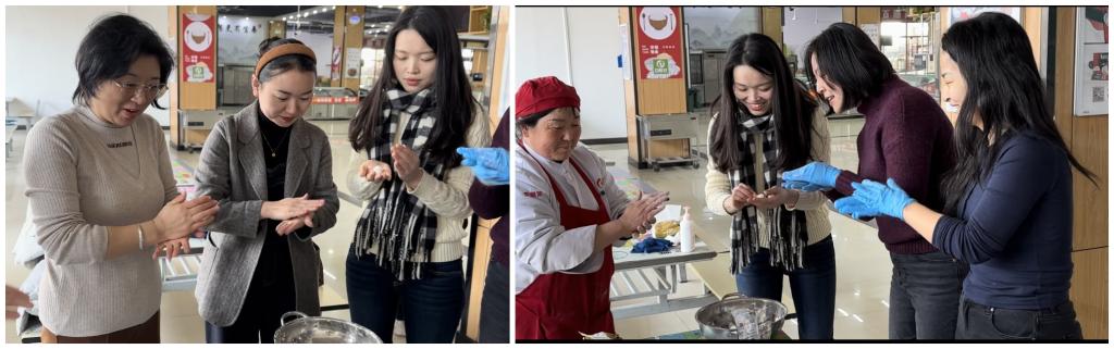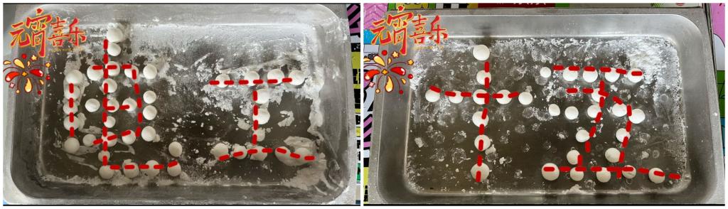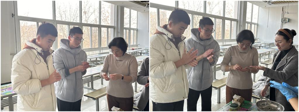 學(xué)工干部提前準(zhǔn)備好糯米粉、黑芝麻等材料,活動(dòng)現(xiàn)場師生們有說有笑,同學(xué)們大都是零基礎(chǔ)的新人,在老師和后勤阿姨們的指點(diǎn)下熟手帶新人,相互交流著包湯圓的訣竅和技法。