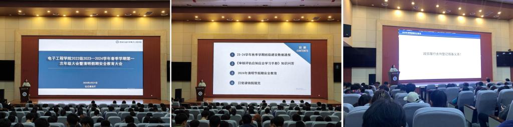 為深化校園安全責任意識,鑄牢學生安全防線,做好清明節(jié)假期安全教育工作,強化學生安全意識,預防和減少各類安全事故的發(fā)生,營造安全、有序、健康、文明的校園環(huán)境,電子工程學院各年級利用年級大會、主題班會等方式于2024年3月27日-4月2日開展清明假期安全教育。