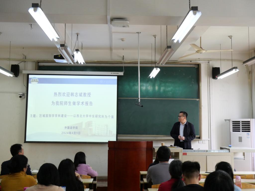 為推進(jìn)我校區(qū)域國(guó)別學(xué)學(xué)科建設(shè),2024年4月9日下午,外國(guó)語(yǔ)學(xué)院邀請(qǐng)西北大學(xué)社科處處長(zhǎng)、中東研究所所長(zhǎng)、博士生導(dǎo)師韓志斌教授,在東方石油樓1104教室,做《區(qū)域國(guó)別學(xué)學(xué)科建設(shè)——以西北大學(xué)中東研究所為個(gè)案》專題報(bào)告。學(xué)院黨委書記田虹霞、副院長(zhǎng)劉輝、陳武、學(xué)院教師聆聽(tīng)了此次報(bào)告。報(bào)告由副院長(zhǎng)劉輝主持。