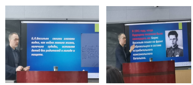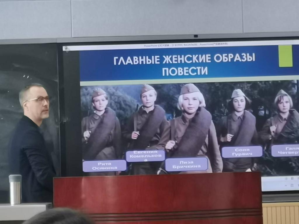 講座中,德米特里以生動(dòng)的語言和豐富的知識(shí),向?qū)W生們介紹了鮑里斯·利沃維奇·瓦西里耶夫的生平經(jīng)歷、文學(xué)成就,以及其代表作的主題和意義。主講人重點(diǎn)分析了作家的成名作《未列入名冊(cè)》和《這里的黎明靜悄悄》。借助視頻和圖片,德米特里幫助學(xué)生們更加直觀地感受到作品中所描繪的場景和人物形象,加深了他們對(duì)瓦西里耶夫文學(xué)世界的認(rèn)識(shí)和理解,了解戰(zhàn)爭的殘酷和蘇聯(lián)人民的英勇。分析作品時(shí)德米特里圍繞小說中的人物和故事情節(jié),與學(xué)生展開問答互動(dòng),同學(xué)們的爭相回答令現(xiàn)場氣氛變得活躍而熱烈。