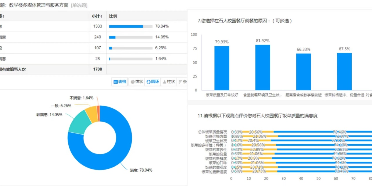 本次師生滿意度調(diào)查共回收有效問卷6253份,其中餐飲服務(wù)企業(yè)問卷4013份,物業(yè)服務(wù)企業(yè)問卷2240份。通過詳實的數(shù)據(jù)統(tǒng)計與分析,準確分析了師生的意見建議,為考核工作收集了重要的基礎(chǔ)數(shù)據(jù)。