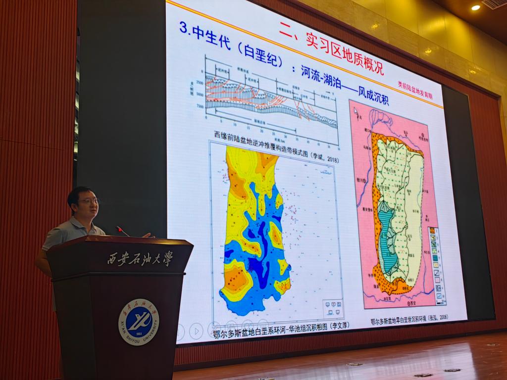 隨后,楊懿介紹實(shí)習(xí)區(qū)的區(qū)域地質(zhì)概況和實(shí)習(xí)期間相關(guān)管理要求和注意事項(xiàng)。首先他介紹了實(shí)習(xí)區(qū)的地質(zhì)構(gòu)造特點(diǎn)、地層巖性特征以及地層年代分布,隨后講解了實(shí)習(xí)任務(wù),他提出,希望同學(xué)們?cè)诿總€(gè)實(shí)習(xí)階段開始之前做足準(zhǔn)備,能夠更好地完成后面的學(xué)習(xí)任務(wù),并再次強(qiáng)調(diào)安全是重中之重,要確保安全、圓滿完成本次實(shí)習(xí)活動(dòng)。