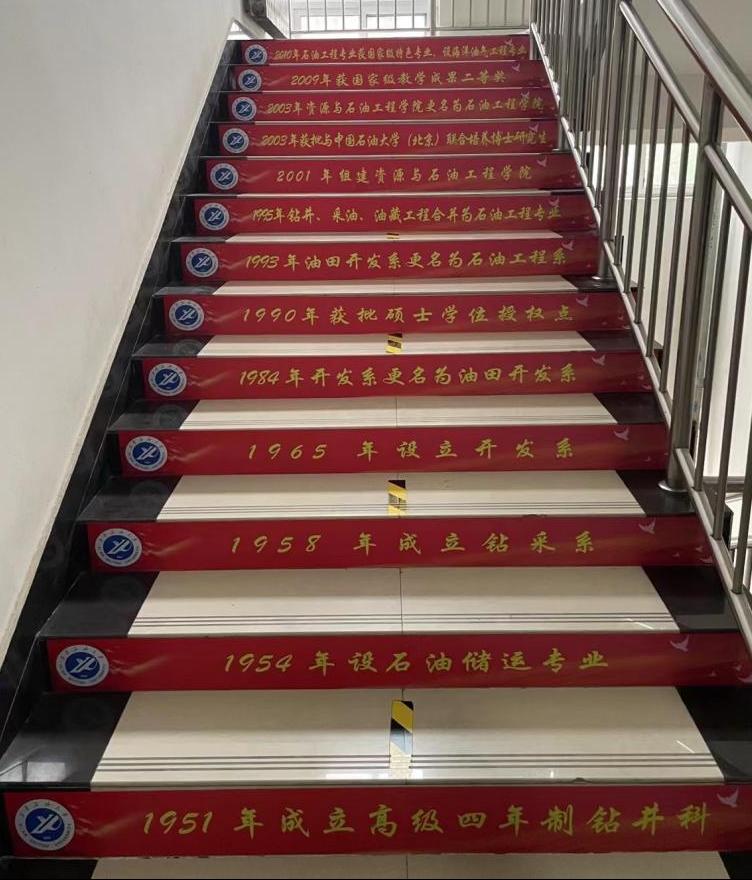 二至三層的樓梯貼紙,展現(xiàn)了學(xué)院從1951年成立高級四年制鉆井科以來的發(fā)展歷程和輝煌成就,其中包括辦學(xué)特色、專業(yè)體系、師資隊伍、教學(xué)成果、科研實力等等,旨在讓廣大師生深入了解學(xué)院的悠久歷史、發(fā)展歷程和辦學(xué)成果,弘揚和傳承學(xué)院優(yōu)秀傳統(tǒng),展示學(xué)院發(fā)展風(fēng)貌,增強學(xué)生行業(yè)自信和專業(yè)自信,全面推進學(xué)院各項工作高質(zhì)量發(fā)展。