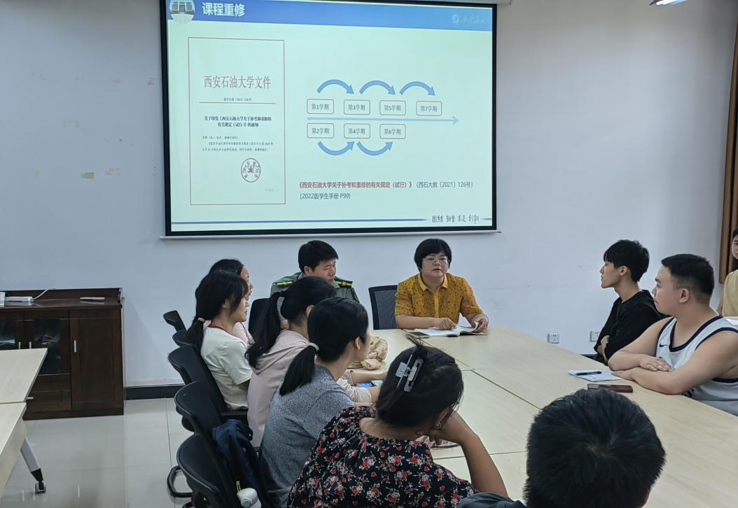 會上,尹老師以《西安石油大學(xué)關(guān)于補(bǔ)考和重修的有關(guān)規(guī)定(試行)》(西石大教〔2021〕126號)為切入點(diǎn),詳細(xì)講解了學(xué)籍異動學(xué)生關(guān)心的各類課程問題;同時從學(xué)籍管理角度,再次提醒21級準(zhǔn)畢業(yè)生核對個人課程和成績,尤其要對公共課加強(qiáng)查漏補(bǔ)缺,鼓勵他們第7學(xué)期課程務(wù)必好好學(xué)習(xí)全部通過。