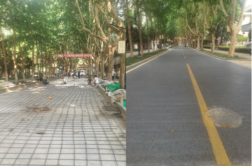 4.雁塔校區(qū)主干道路改造。雁塔校區(qū)主干道路面出現(xiàn)局部沉降、開裂,為保證行車安全。暑假期間,后勤處聯(lián)系海綿工程項(xiàng)目部對有問題的路面進(jìn)行維修加固。本次海綿項(xiàng)目部維修加固路面約700平方米。