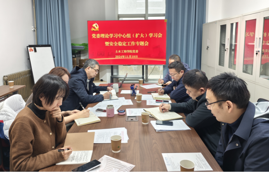 11 月 18 日,土木工程學(xué)院黨委召開2024年11月理論學(xué)習(xí)中心組(擴(kuò)大)學(xué)習(xí)會(huì)暨安全穩(wěn)定專題會(huì),學(xué)院理論學(xué)習(xí)中心組成員及各辦公室主任、實(shí)驗(yàn)室主任和系主任參加會(huì)議。會(huì)議由學(xué)院黨委書記賈莉娜主持。