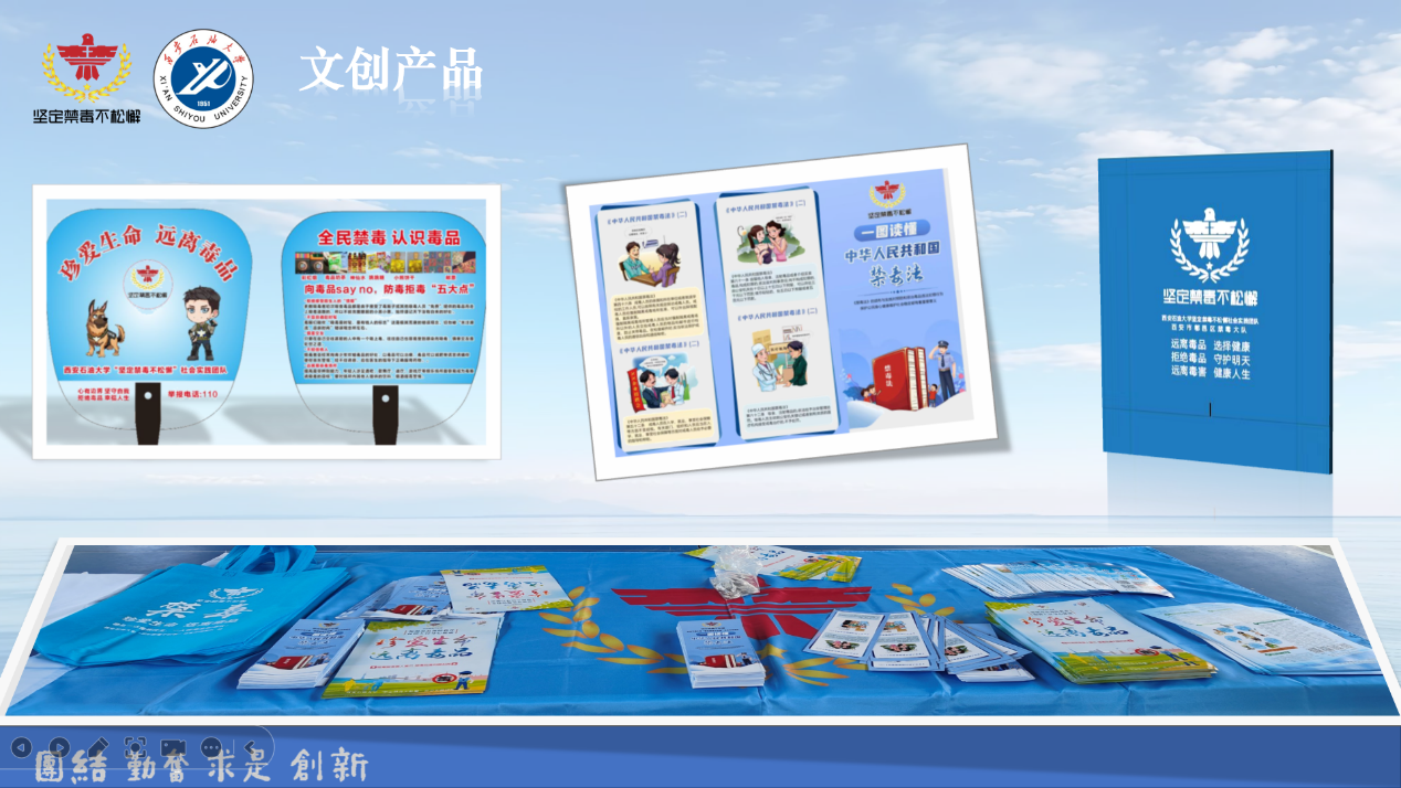 實踐活動開始前,為了擴大禁毒宣傳效果,團隊成員創(chuàng)作了6幅禁毒宣傳海報,設計了印有禁毒知識的扇子,漫畫三折頁以及環(huán)保手提袋等文創(chuàng)產品。