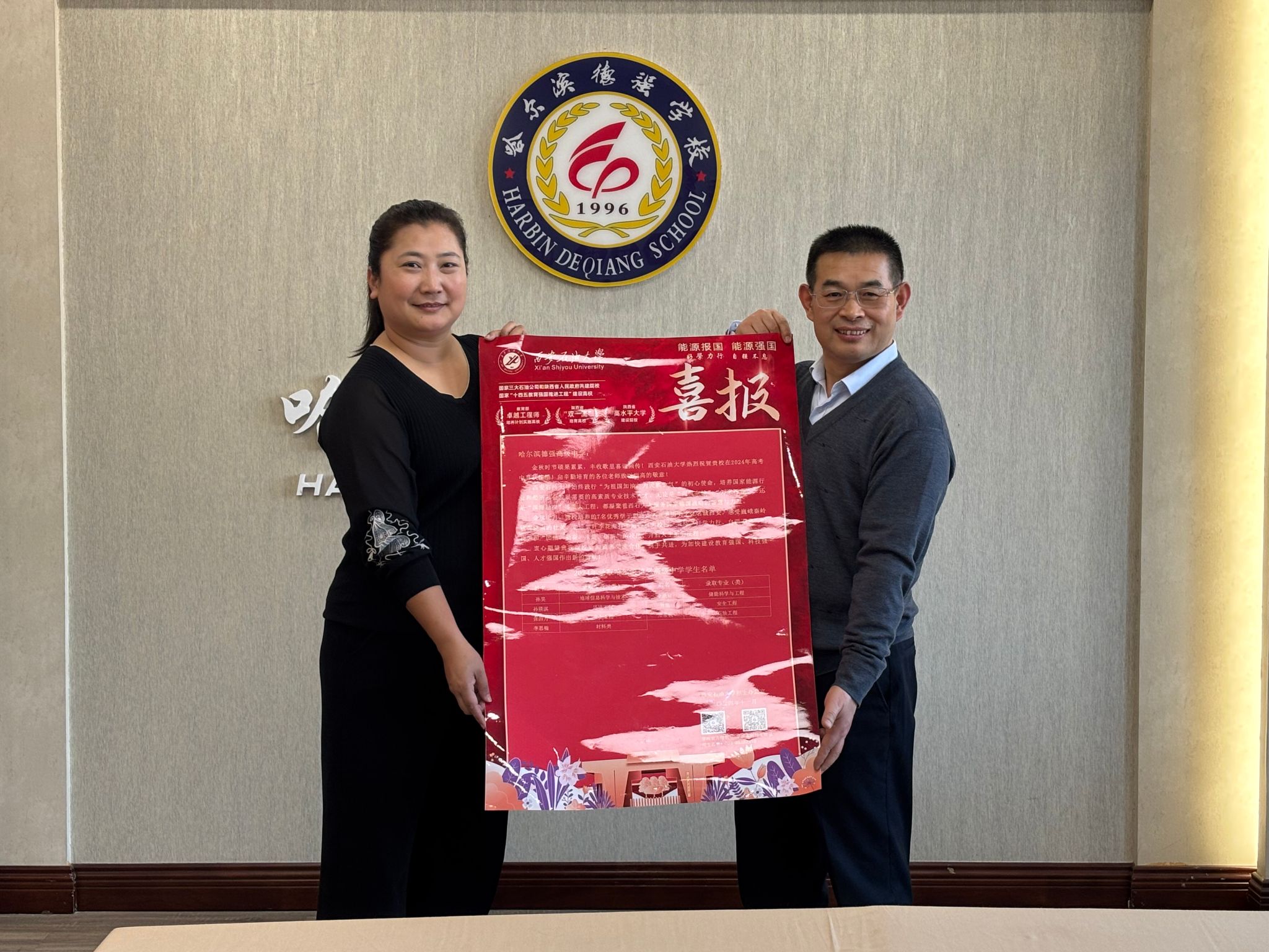 龐秉謙代表學校與哈爾濱德強高級中學張金玲副校長簽署了《西安石油大學優(yōu)秀生源基地建設協(xié)議》,授予“優(yōu)秀生源基地”牌匾并贈送了錄取喜報。