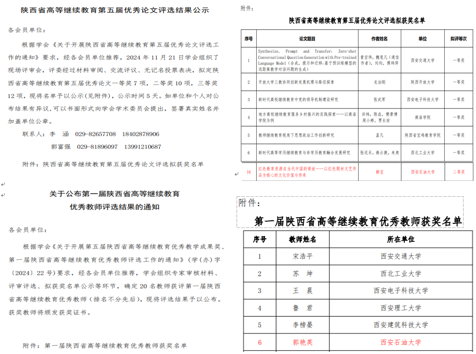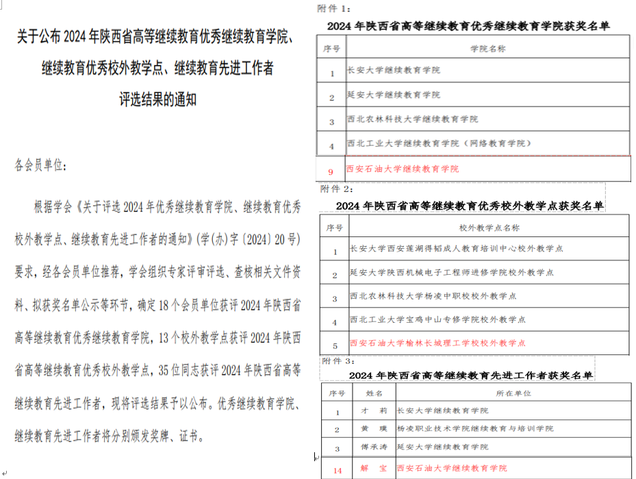 近日,在陜西省教育廳指導(dǎo)下、陜西省高等繼續(xù)教育學(xué)會(huì)組織實(shí)施的兩年一次的各類評比評選中,我校繼續(xù)教育工作獲得多項(xiàng)榮譽(yù)表彰。在“2024年陜西省高等繼續(xù)教育優(yōu)秀繼續(xù)教育學(xué)院、繼續(xù)教育優(yōu)秀校外教學(xué)站點(diǎn)、繼續(xù)教育先進(jìn)工作者”評選中,我校繼續(xù)教育學(xué)院(培訓(xùn)中心)榮獲“陜西省高等繼續(xù)教育優(yōu)秀繼續(xù)教育學(xué)院”,我校榆林長城理工學(xué)校校外教學(xué)點(diǎn)獲得“陜西省繼續(xù)教育優(yōu)秀校外教學(xué)站點(diǎn)”,繼續(xù)教育學(xué)院(培訓(xùn)中心)解寶榮獲“陜西省高等繼續(xù)教育先進(jìn)工作者”稱號;在“陜西省高等繼續(xù)教育第五屆優(yōu)秀論文”評選中,繼續(xù)教育學(xué)院(培訓(xùn)中心)解寶獲得優(yōu)秀論文二等獎(jiǎng);在“陜西省第一屆高等繼續(xù)教育優(yōu)秀教師”評選中,馬克思主義學(xué)院郭艷英榮獲“陜西省高等繼續(xù)教育優(yōu)秀教師”稱號。