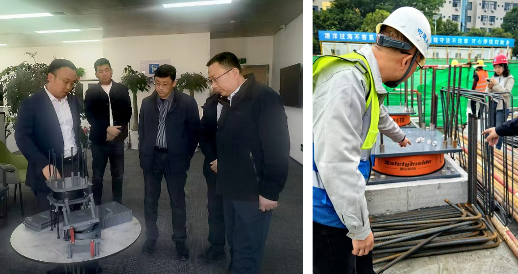 在施工現(xiàn)場,施工企業(yè)介紹了減隔震裝置的施工工藝。雙方圍繞減隔震裝置的安裝位置、固定方式、連接節(jié)點、后期維護等施工細節(jié)展開了重點探討。施工企業(yè)也分享了他們的經(jīng)驗和建議。