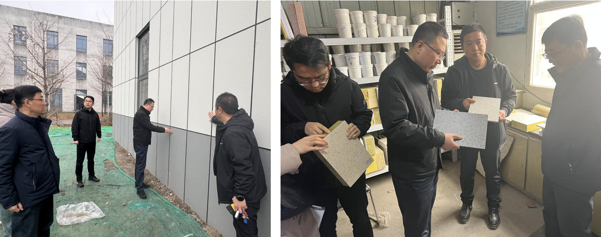 在保溫一體板產(chǎn)品廠家及施工現(xiàn)場,基建處一行進入廠區(qū),仔細觀察保溫一體板的色澤、紋理,觸摸其表面質(zhì)感,查看板材的厚度,并于廠家就保溫性能、安裝工藝、在校園建筑中的適用性、耐用性、美觀性等方面進行了探討。