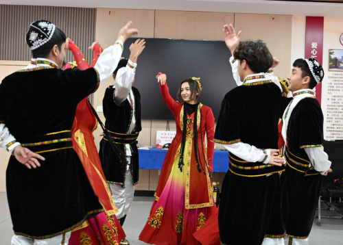 隨后,少數(shù)民族預科班學生為孩子們表演了一段熱情洋溢的民族舞。伴隨歡快的旋律,學生們以靈動的舞姿展現(xiàn)維吾爾族舞蹈的獨特魅力,旋轉的裙擺與孩子們燦爛的笑臉交相輝映。這場文化互動不僅為孩子們送去溫暖陪伴,更架起民族文化交流的橋梁,讓民族團結、友愛互助的種子在童心中悄然生長。