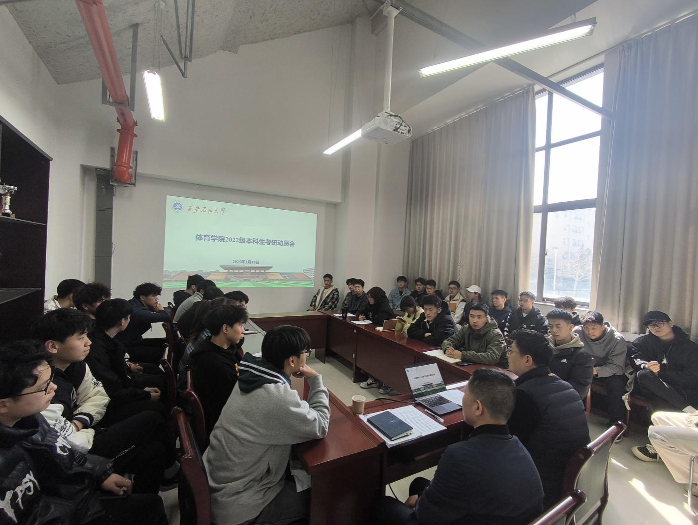 為進一步充分調(diào)動同學們的考研積極性,堅定考研決心,增強考研自信心,更好地挖掘自身潛能,把握深造機會,體育學院在前期對有考研意向?qū)W生進行摸底的基礎上,于3月19日下午在鄠邑校區(qū)東體育場體育學院208會議室召開2022級學生考研動員暨指導會。體育學院黨總支書記書記茍毅飛出席會議。2022級學生參加會議。會議由學工辦主任姜國平主持。