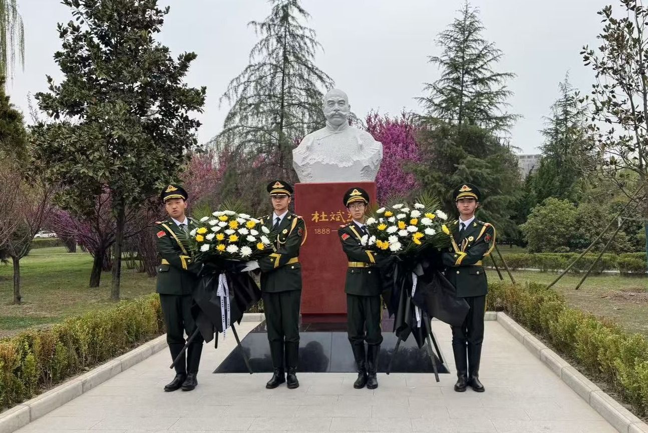 晨光中,杜斌丞烈士雕像巍峨矗立,寄托著無(wú)盡追思,我校國(guó)旗護(hù)衛(wèi)隊(duì)隊(duì)員邁著整齊的步伐,向杜斌丞烈士雕像敬獻(xiàn)了花籃。