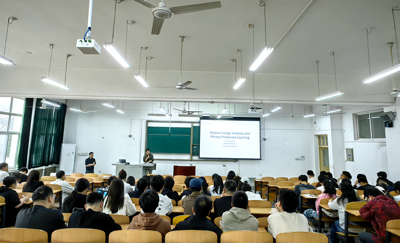 鄧晶晶博士2017年于英國斯旺西大學計算機系斬獲計算視覺博士學位,后入職杜倫大學計算機科學系的VIViD小組,同時聯(lián)合多所高校牽頭創(chuàng)建JLAI實驗室,領(lǐng)導Rand2AI研究小組,致力于前沿計算模型開發(fā),其在聯(lián)邦學習的醫(yī)學健康數(shù)據(jù)隱私研究領(lǐng)域成果突出,贏得NVIDIA、Intel、AMD等業(yè)界巨擘的青睞與支持。鄧博士通過圖文結(jié)合的方式,深入淺出地講解了醫(yī)學圖像處理前沿技術(shù)以及隱私保護的關(guān)鍵要點,結(jié)合實例闡述計算機相關(guān)專業(yè)理論。講座結(jié)尾還進行了提問互動環(huán)節(jié),現(xiàn)場氣氛輕松熱烈。此次講座為師生們進一步打開了思維視野,豐富了研究方向,拓寬了學術(shù)邊界。