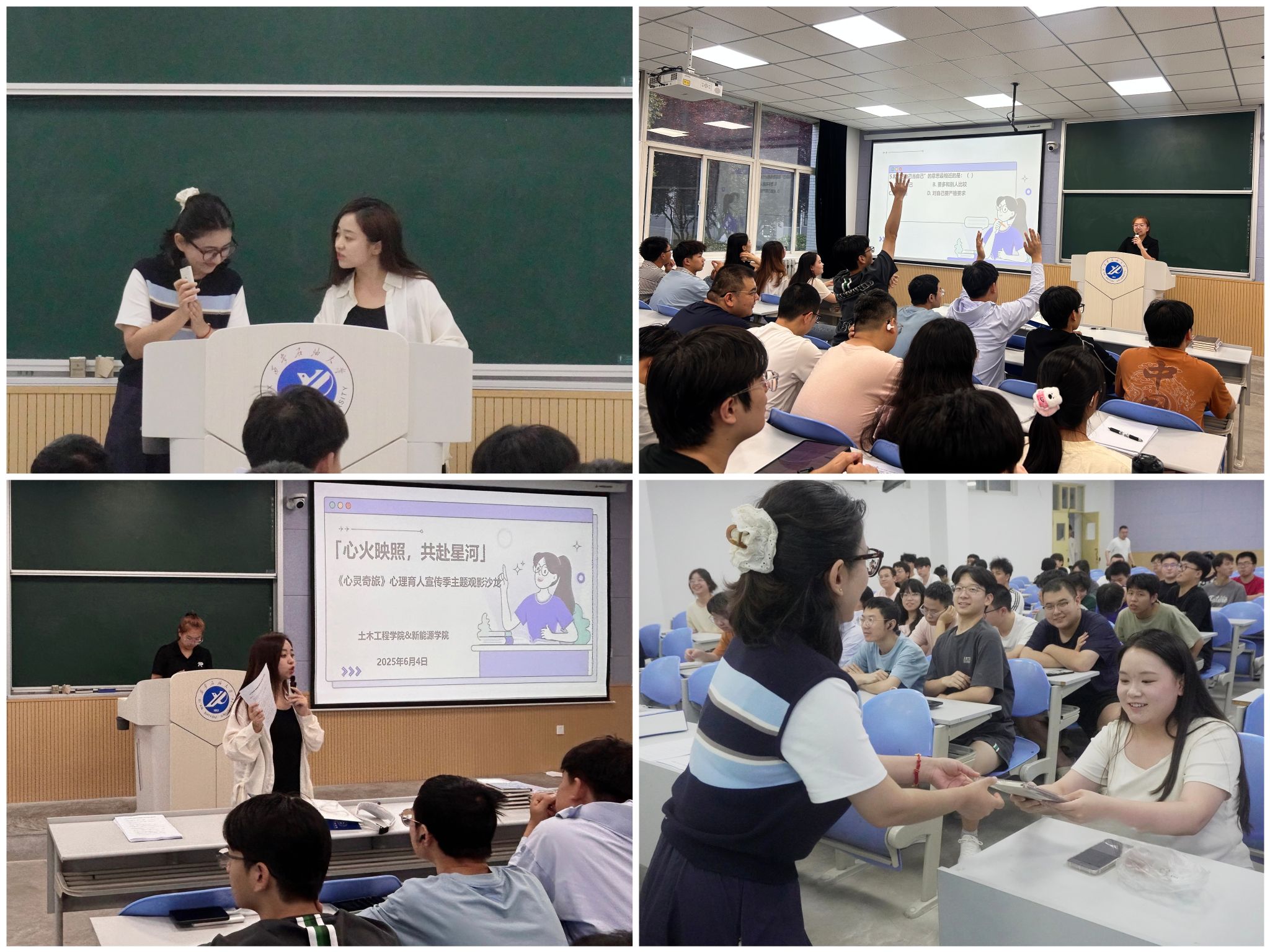 為深入推進(jìn)心理健康教育工作,提升學(xué)生心理調(diào)適能力,營(yíng)造積極向上的校園文化氛圍,6月4日晚,管道工程學(xué)院與新能源學(xué)院于鄠邑校區(qū)A108聯(lián)合舉辦了“心火映照,共赴星河”——心理育人宣傳季主題觀影沙龍活動(dòng)。心理專干教師奴麗艷木·夏甫開(kāi)提、秦瑩穎擔(dān)任活動(dòng)主持人,學(xué)生代表90余人參加活動(dòng)。