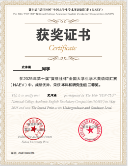 近日,第十屆“復旦社杯”全國大學生學術(shù)英語詞匯賽(The10th“FDPCup”CollegeAcademic English Vocabulary Competition)圓滿落幕。我校胡佳美、喻越、石銳東等25名同學榮獲一等獎,梁旗凱、楊晨曦、史沐涵等25位同學獲得二等獎,張晨萱、鄧文杰、任依婷等39位同學獲得三等獎。