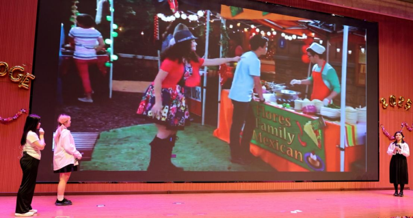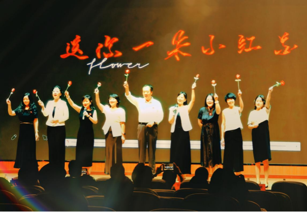 本次匯報(bào)演出共24個(gè)節(jié)目,分別由《英語電影賞析》《英語歌曲與英語文化》《中國文化推介》《跨文化交際視聽說》《英漢翻譯技巧與實(shí)踐》和《實(shí)用英語寫作》6門大學(xué)英語拓展課程的同學(xué)及教師參演。節(jié)目異彩紛呈,涵蓋了電影配音、拓展課程介紹、歌曲演唱、英語話劇、跨文化情景劇短視頻、舞蹈、相聲等多種形式。在本次課程匯演的舞臺上,外國語學(xué)院第一教學(xué)部拓展課程組教師溫情獻(xiàn)唱,致敬成長,傾情演繹歌曲《送你一朵小紅花》。他們從講臺走向舞臺,用溫暖而真摯的歌聲傳遞著對莘莘學(xué)子的關(guān)愛與期許。這首飽含鼓勵與祝福的旋律,在師生心中播撒下溫暖與力量,成為匯演中一抹動人的亮色,生動詮釋了和諧融洽、積極向上的校園文化氛圍與教育溫度。