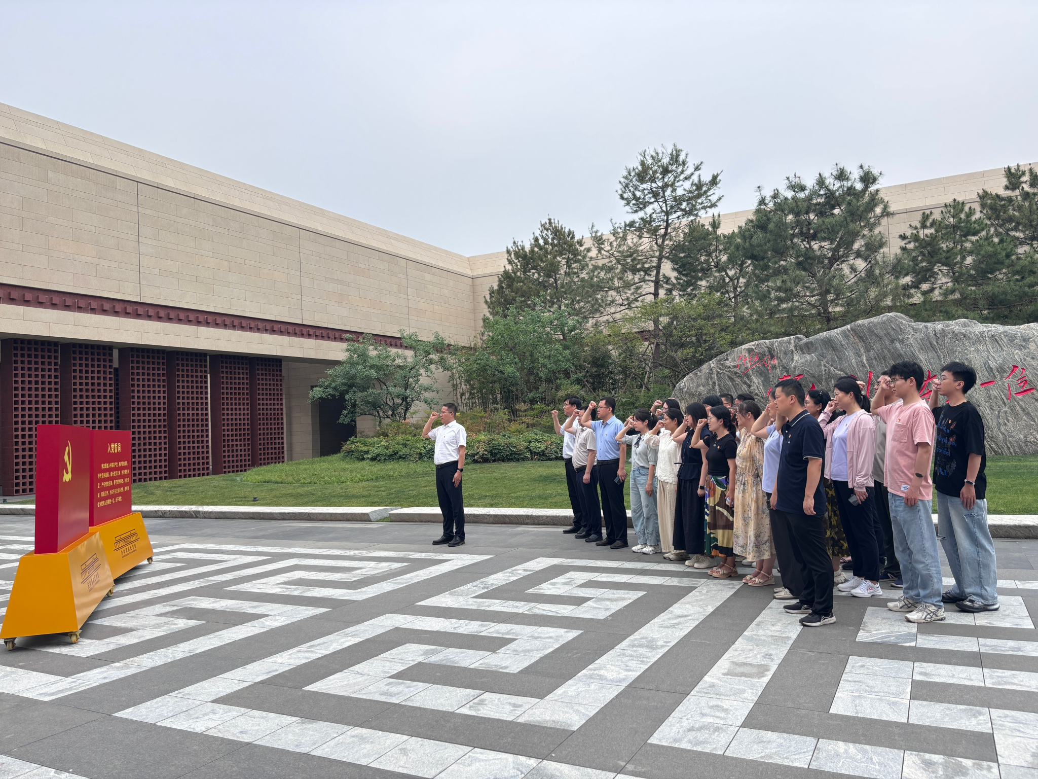 在紀(jì)念館庭院,學(xué)院黨委書記席利哲帶領(lǐng)全體黨員面向黨旗重溫入黨誓詞?!拔抑驹讣尤胫袊伯a(chǎn)黨,擁護黨的綱領(lǐng)……” 鏗鏘有力的誓言,字字千鈞,響徹云霄,既是對革命先烈的深切緬懷與崇高致敬,更是全體黨員對黨和人民作出的莊嚴(yán)承諾與堅定表白。