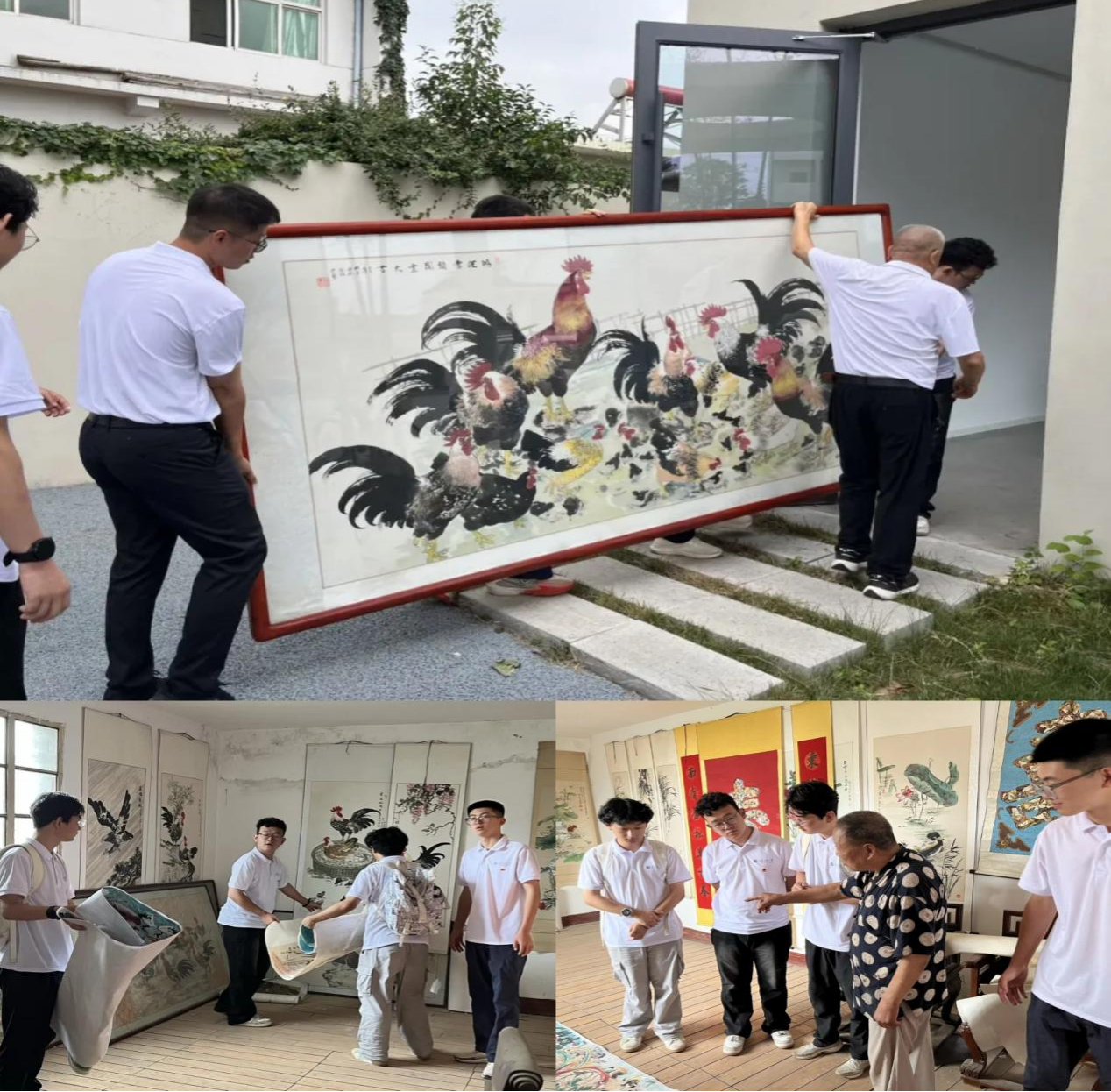 7月7日,實(shí)踐團(tuán)探訪國(guó)家級(jí)非遺傳承人段桂榮老人的畫(huà)室,了解關(guān)中農(nóng)民畫(huà)的文化內(nèi)涵與藝術(shù)價(jià)值。老人創(chuàng)作的《牡丹小雞》等作品,以公雞象征勤勞與希望,展現(xiàn)了深厚的鄉(xiāng)土文化底蘊(yùn)。實(shí)踐團(tuán)協(xié)助將老人耗時(shí)三月完成的巨型公雞畫(huà)移送至村傳統(tǒng)文化紀(jì)念館,助力非遺文化的保護(hù)與展示。隊(duì)員們表示,將積極搭建橋梁,推動(dòng)傳統(tǒng)技藝在當(dāng)代煥發(fā)新活力。