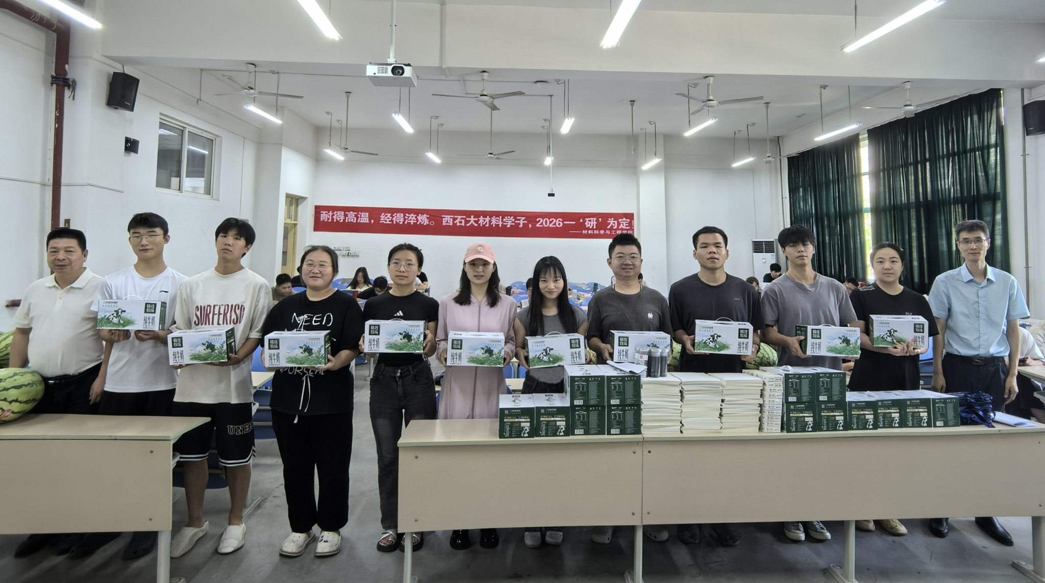 活動(dòng)現(xiàn)場(chǎng),耿嶺和屈敏佳代表學(xué)院向留校學(xué)生發(fā)放了牛奶、西瓜、文具等慰問品,希望同學(xué)們以更加飽滿的精神狀態(tài)投入到復(fù)習(xí)備考當(dāng)中,爭(zhēng)取取得優(yōu)異成績(jī)。