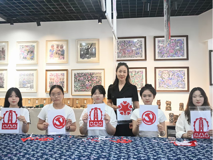實踐團隊首站赴信天游民間藝術(shù)展覽館開展實地調(diào)研,系統(tǒng)深入地學(xué)習(xí)了國家級非物質(zhì)文化遺產(chǎn)"延安剪紙"及其衍生藝術(shù)形式熏畫、剪紙畫的歷史淵源與發(fā)展脈絡(luò)。團隊成員與非遺傳承人張寧進行了深入交流訪談,并在其悉心指導(dǎo)下開展了剪紙技法實操訓(xùn)練,切身感受了剪刀與紅紙間所蘊含的文化韻律。此次實踐活動得到了延安市當?shù)孛襟w的關(guān)注,通過媒體傳播不僅有效提升了非物質(zhì)文化遺產(chǎn)的時代影響力,更引發(fā)了社會各界對傳統(tǒng)文化創(chuàng)造性轉(zhuǎn)化、創(chuàng)新性發(fā)展的深入思考——當千年剪紙紋樣與革命圣地精神深度融合,中華文明的根脈與紅色文化的精神脈絡(luò)在剪紙藝術(shù)中實現(xiàn)了有機統(tǒng)一與創(chuàng)新發(fā)展。