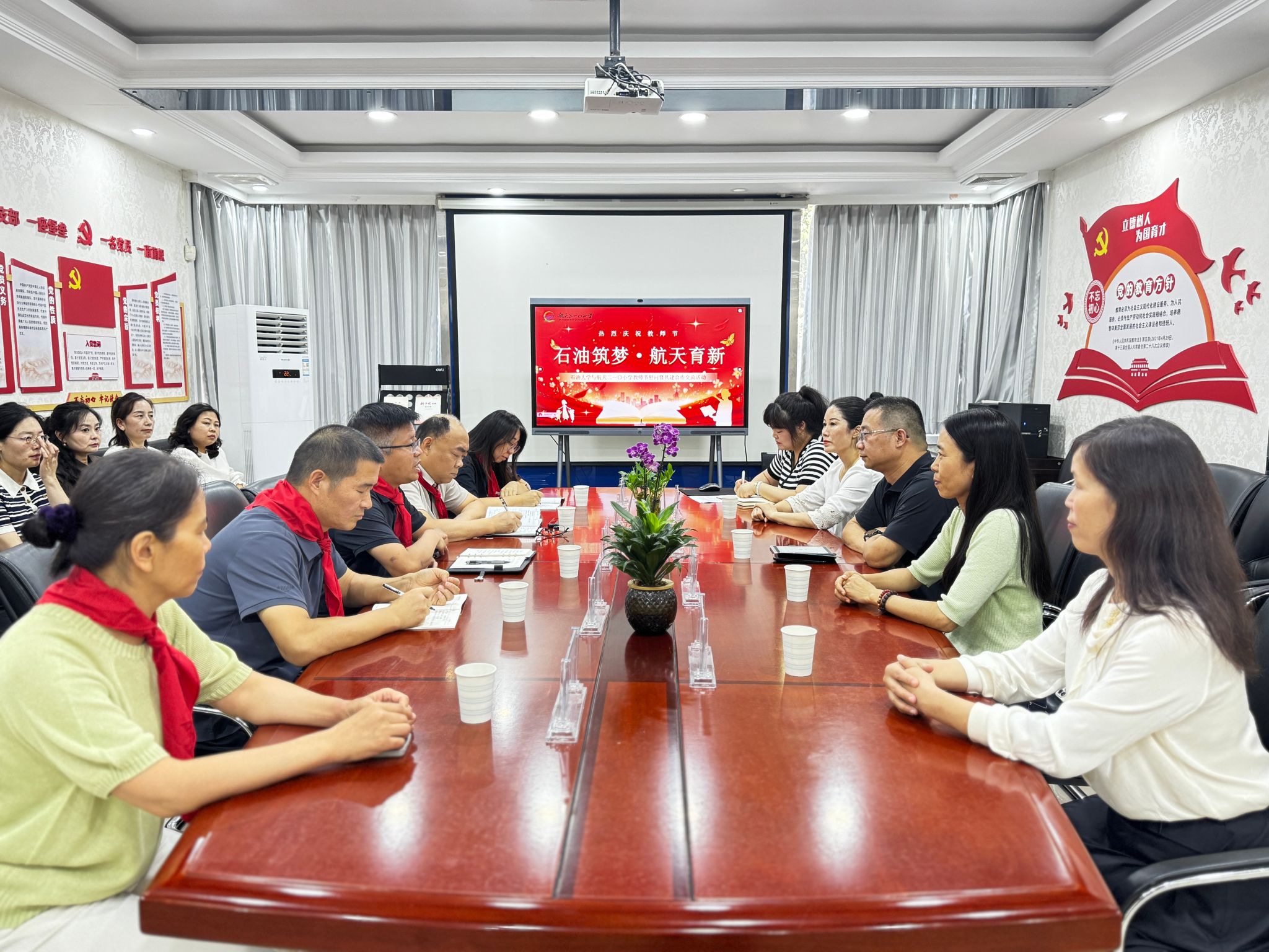 慶祝教師節(jié)活動上,航天210小學(xué)的少先隊員代表為張驍勇一行敬獻了紅領(lǐng)巾。活動結(jié)束后,雙方就合作共建的具體事項進行了深入交流。