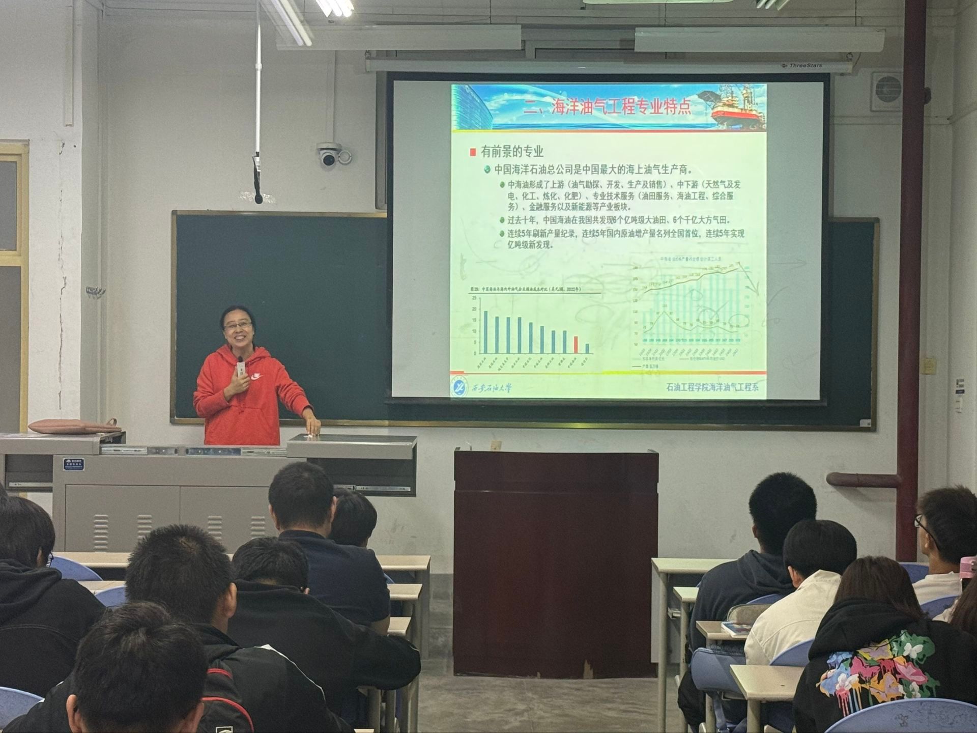 同日下午,蔣海巖教授在博覽樓A225為海油2501、2502班開展專業(yè)教育。她結(jié)合海洋油氣工程的實(shí)際需求,強(qiáng)調(diào)學(xué)生需扎實(shí)掌握專業(yè)理論、工程技能及外語計(jì)算機(jī)應(yīng)用能力,同時(shí)具備團(tuán)隊(duì)協(xié)作與創(chuàng)新意識?,F(xiàn)場還展示了專業(yè)實(shí)驗(yàn)室設(shè)備及獲獎(jiǎng)成果,激勵(lì)學(xué)生以行業(yè)標(biāo)桿為榜樣,不斷追求卓越。