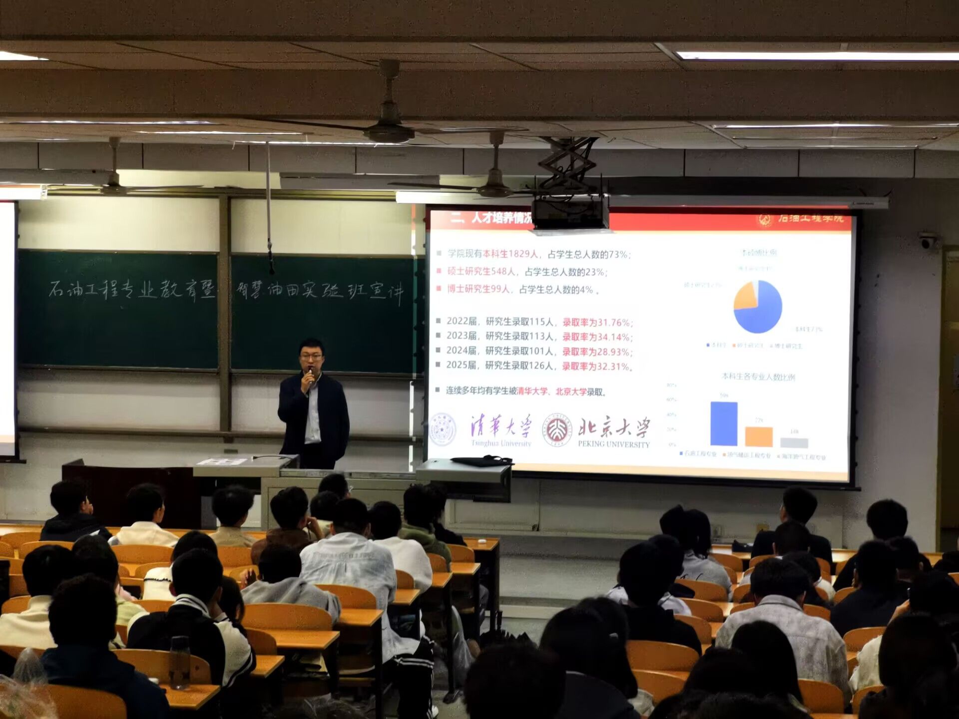 10月11日下午,王琛在博覽樓A139為石工卓越2501、2502班和石工2501—2506學(xué)生開展專業(yè)教育。他詳細(xì)介紹了學(xué)院整體情況,人才培養(yǎng)情況和教學(xué)改革創(chuàng)新方面的基本情況。重點(diǎn)圍繞學(xué)院近年來在教學(xué)改革方面的舉措,包括設(shè)立“智慧油田實(shí)驗(yàn)班”,以“油氣工程+人工智能”為特色,通過小班化、前沿性教學(xué)模式,培養(yǎng)兼具工程實(shí)踐能力和創(chuàng)新思維的高層次人才。他鼓勵(lì)學(xué)生充分利用學(xué)院資源,積極參與學(xué)科競賽和科研項(xiàng)目,提升國際化視野與跨學(xué)科能力