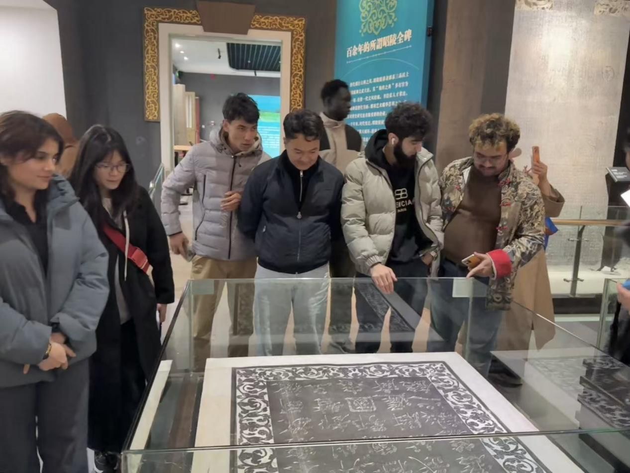 當(dāng)日下午,實(shí)踐團(tuán)隊(duì)前往陜西省咸陽市禮泉縣昭陵博物館,開啟文化研學(xué)之旅。國際學(xué)生在工作人員引導(dǎo)下,先后參觀昭陵文物精華展、昭陵碑林,欣賞昭陵唐墓壁畫。通過聆聽專業(yè)講解與近距離觀賞文物,學(xué)生們將抽象的“盛唐”概念具象化,深刻感受唐代與各國、各民族友好交往、交流、交融的歷史場(chǎng)景,直觀體會(huì)中華文化的厚重底蘊(yùn)。