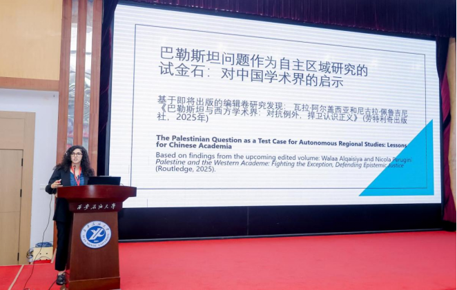西北大學(xué)中東研究所Walaa Alqaisiya博士作題為《The Palestinian Exception in Western Academia:Implications for Chinese Region and Country Studies 》的主旨報(bào)告,通過揭示知識生產(chǎn)體系如何被帝國主義利益結(jié)構(gòu)性侵蝕的重要標(biāo)尺,剖析了西方學(xué)術(shù)界在巴勒斯坦問題研究中的系統(tǒng)性缺陷,探討這些經(jīng)驗(yàn)對構(gòu)建中國區(qū)域與國家研究自主框架的啟示。