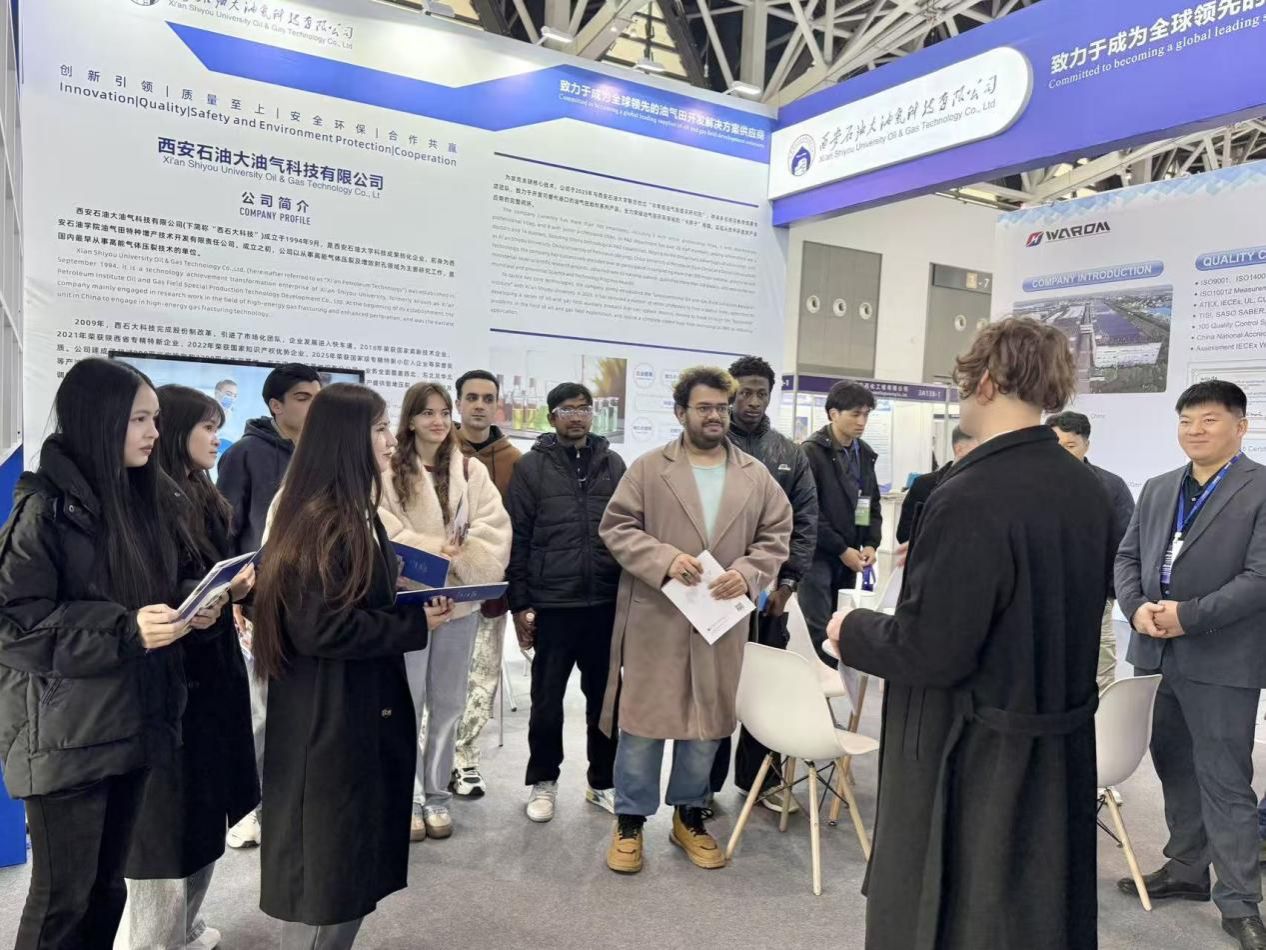 我校學(xué)生在西安石油大油氣科技有限公司外事項(xiàng)目經(jīng)理丹尼斯(研2022級(jí)國際校友)帶領(lǐng)下,詳細(xì)了解了該公司發(fā)展歷程、運(yùn)營模式、技術(shù)應(yīng)用場景及科技成果轉(zhuǎn)化過程。展會(huì)期間,學(xué)生們依次走訪各企業(yè)展位,系統(tǒng)了解了石油鉆采設(shè)備、油氣儲(chǔ)運(yùn)設(shè)備、油氣煉化及精細(xì)化工裝備、泵閥、電機(jī)、儀器儀表等上中下游全產(chǎn)業(yè)鏈條物資裝備。參觀過程中,學(xué)生們結(jié)合專業(yè)知識(shí)主動(dòng)提問,與企業(yè)科研人員深入探討技術(shù)細(xì)節(jié),參展代表逐一耐心解答、細(xì)致引導(dǎo)講解,現(xiàn)場互動(dòng)氛圍熱烈。