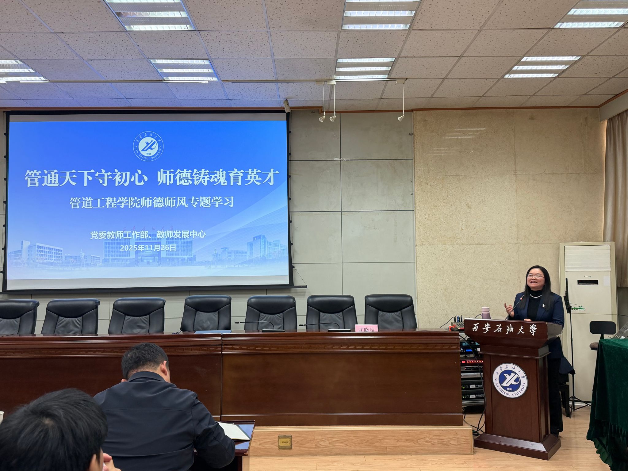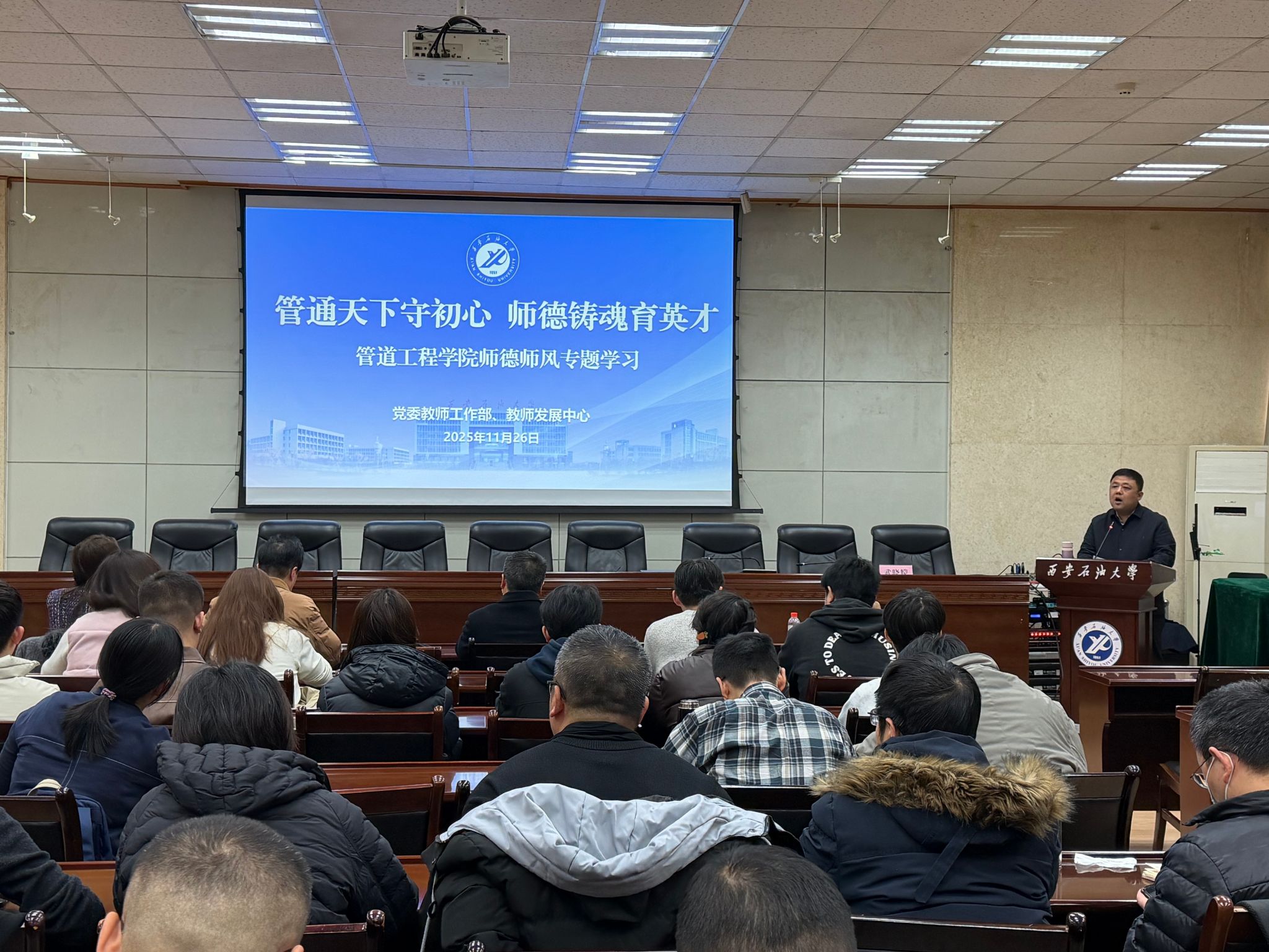 11月26日下午,由管道工程學(xué)院黨委主辦的“學(xué)黨章鑄忠誠,悟思想強(qiáng)使命”專題學(xué)習(xí)班第一講在雁塔校區(qū)西階第三會議室舉行。校黨委教師工作部部長、教師發(fā)展中心主任武曉朦教授擔(dān)任主講,主講題目為“管通天下守初心 師德鑄魂育英才”,學(xué)院全體教職工及研究生代表參加學(xué)習(xí)。會議由學(xué)院黨委副書記高亮主持。