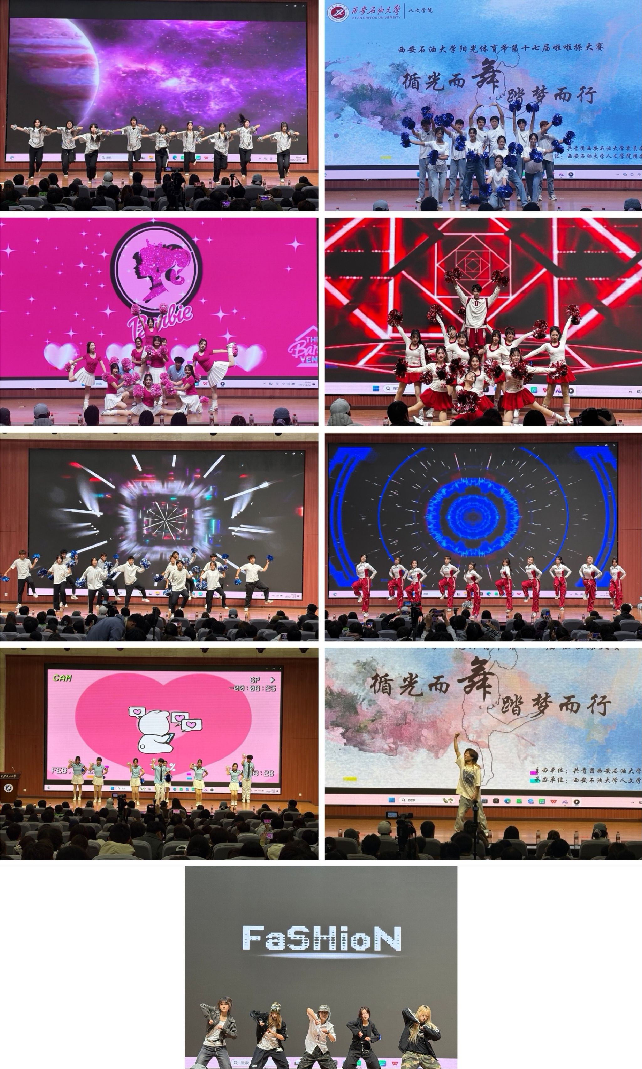 為進(jìn)一步豐富校園文化生活,營造積極向上、充滿活力的校園氛圍,11月26日晚,西安石油大學(xué)第十七屆陽光體育節(jié)“循光而舞,踏夢而行”啦啦操大賽在弘石報(bào)告廳隆重舉行。本次大賽由人文學(xué)院承辦,人文學(xué)院2025級輔導(dǎo)員張馨元老師,校、院兩級學(xué)生會代表出席活動(dòng),各學(xué)院共400余名學(xué)生到場觀看。