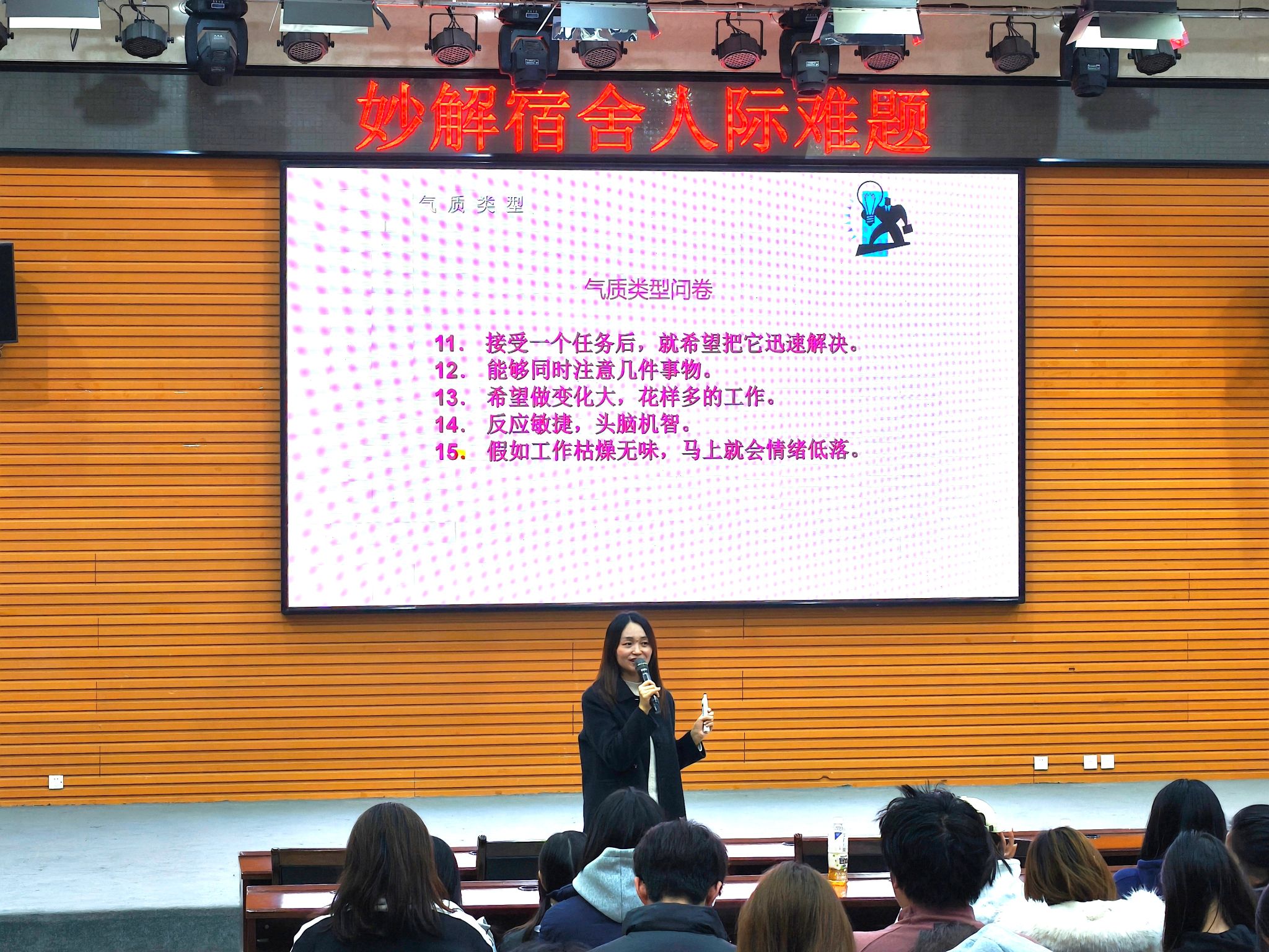 在互動環(huán)節(jié),趙老師引入了“氣質(zhì)類型”這一心理學(xué)概念,現(xiàn)場發(fā)放氣質(zhì)類型測試問卷,同學(xué)們通過答題計(jì)算得分,了解自己屬于膽汁質(zhì)、多血質(zhì)、粘液質(zhì)還是抑郁質(zhì)。結(jié)合四大名著中的經(jīng)典人物形象,趙老師生動闡釋了不同氣質(zhì)類型的特點(diǎn),幫助同學(xué)們更好地認(rèn)識自我與他人。針對如何應(yīng)對人際沖突,趙老師通過具體實(shí)例,分析了沖突可能帶來的積極與消極影響,并強(qiáng)調(diào)正確處理沖突的重要性。她重點(diǎn)分享了三個實(shí)用溝通技巧:“知覺檢核法”、“枕頭法”與“合作(雙贏)法”。為加深理解,現(xiàn)場邀請四位同學(xué)上臺演繹宿舍情景短劇,生動展示如何運(yùn)用這些方法有效化解日常矛盾。