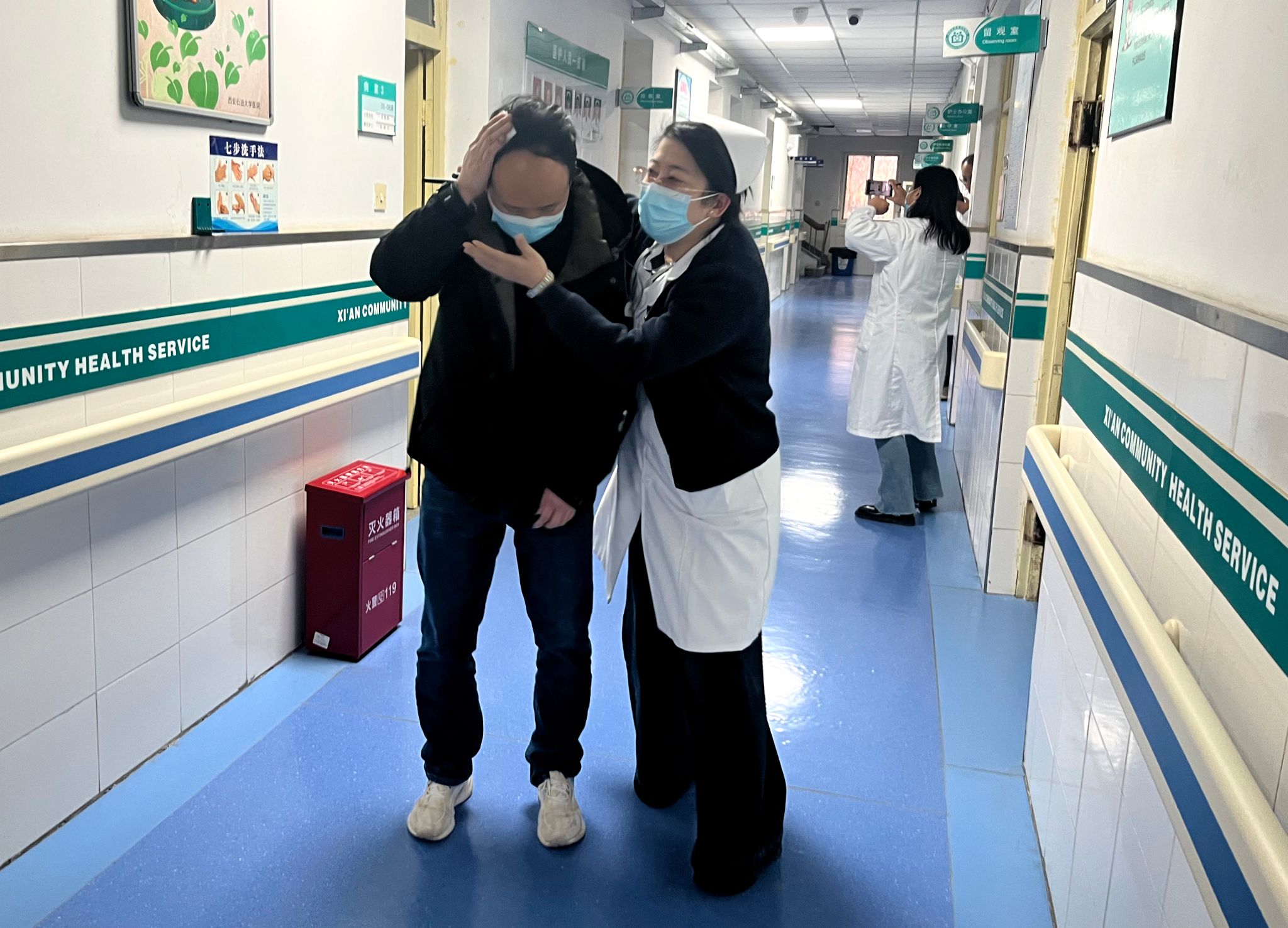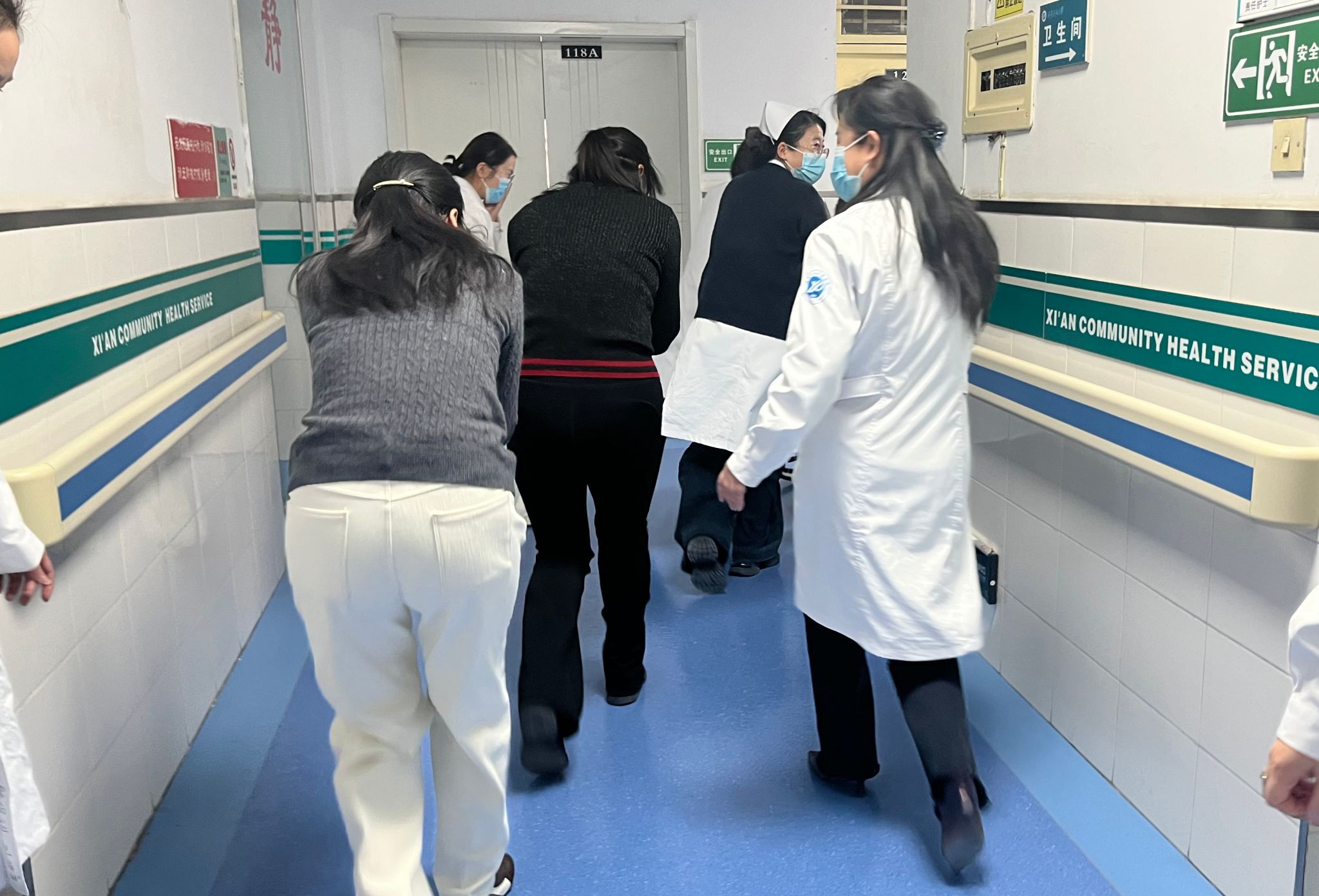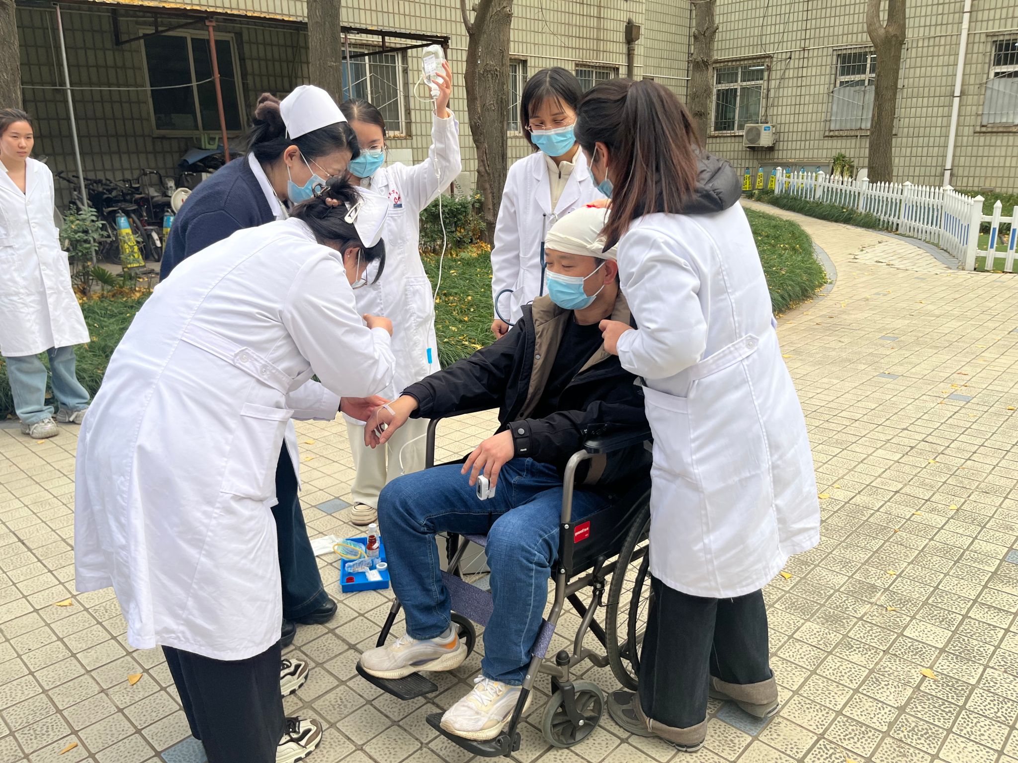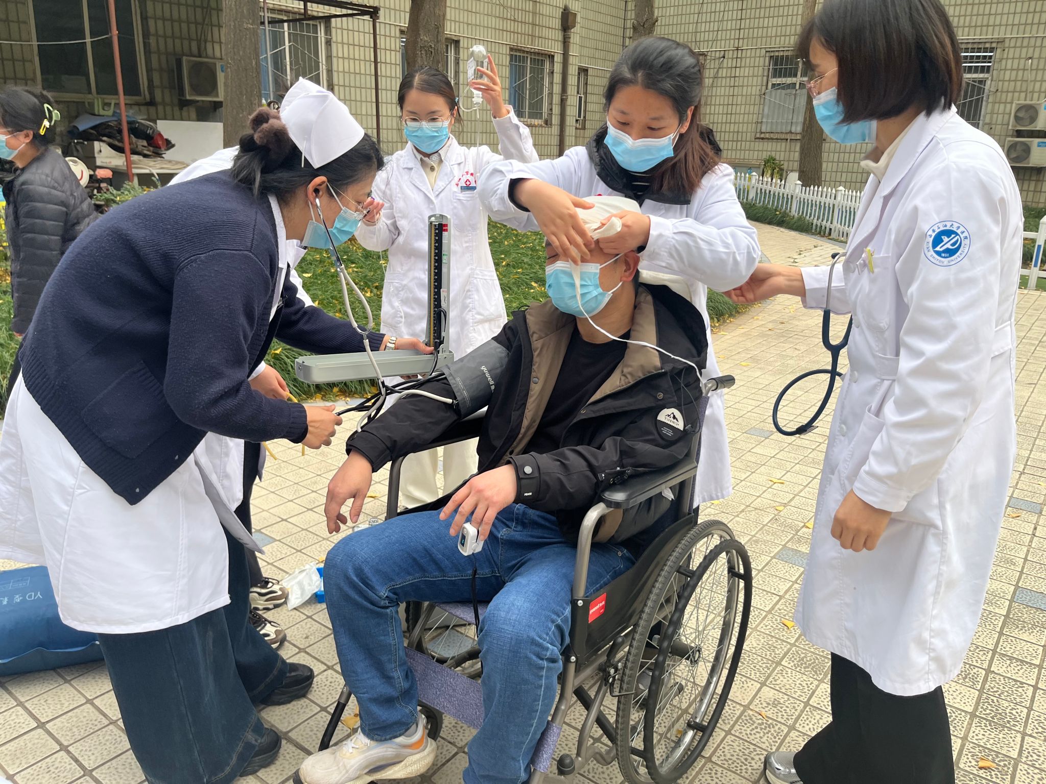 與此同時(shí),疏散引導(dǎo)人員快速打開安全出口,引導(dǎo)就診患者及醫(yī)護(hù)人員用濕毛巾捂住口鼻,彎腰低姿沿預(yù)定疏散路線快速撤離。針對(duì)行動(dòng)不便的模擬患者,工作人員采用攙扶、輪椅轉(zhuǎn)運(yùn)等方式全程協(xié)助,做到不推擠、不遺漏,確保所有人員在規(guī)定時(shí)間內(nèi)安全撤離至室外指定集合點(diǎn),各小組隨即快速清點(diǎn)人數(shù)并向指揮部匯報(bào)。醫(yī)院應(yīng)急醫(yī)療小組同步在疏散現(xiàn)場搭建臨時(shí)救護(hù)點(diǎn),丁麗團(tuán)隊(duì)全力協(xié)助醫(yī)療演練開展,配合做好救護(hù)物資轉(zhuǎn)運(yùn)、模擬患者傷情配合、救治現(xiàn)場輔助等工作,助力醫(yī)療小組高效完成傷口處理、吸氧、頭部包扎等緊急救治流程,充分彰顯醫(yī)療應(yīng)急處置的專業(yè)性與團(tuán)隊(duì)協(xié)作的高效性。