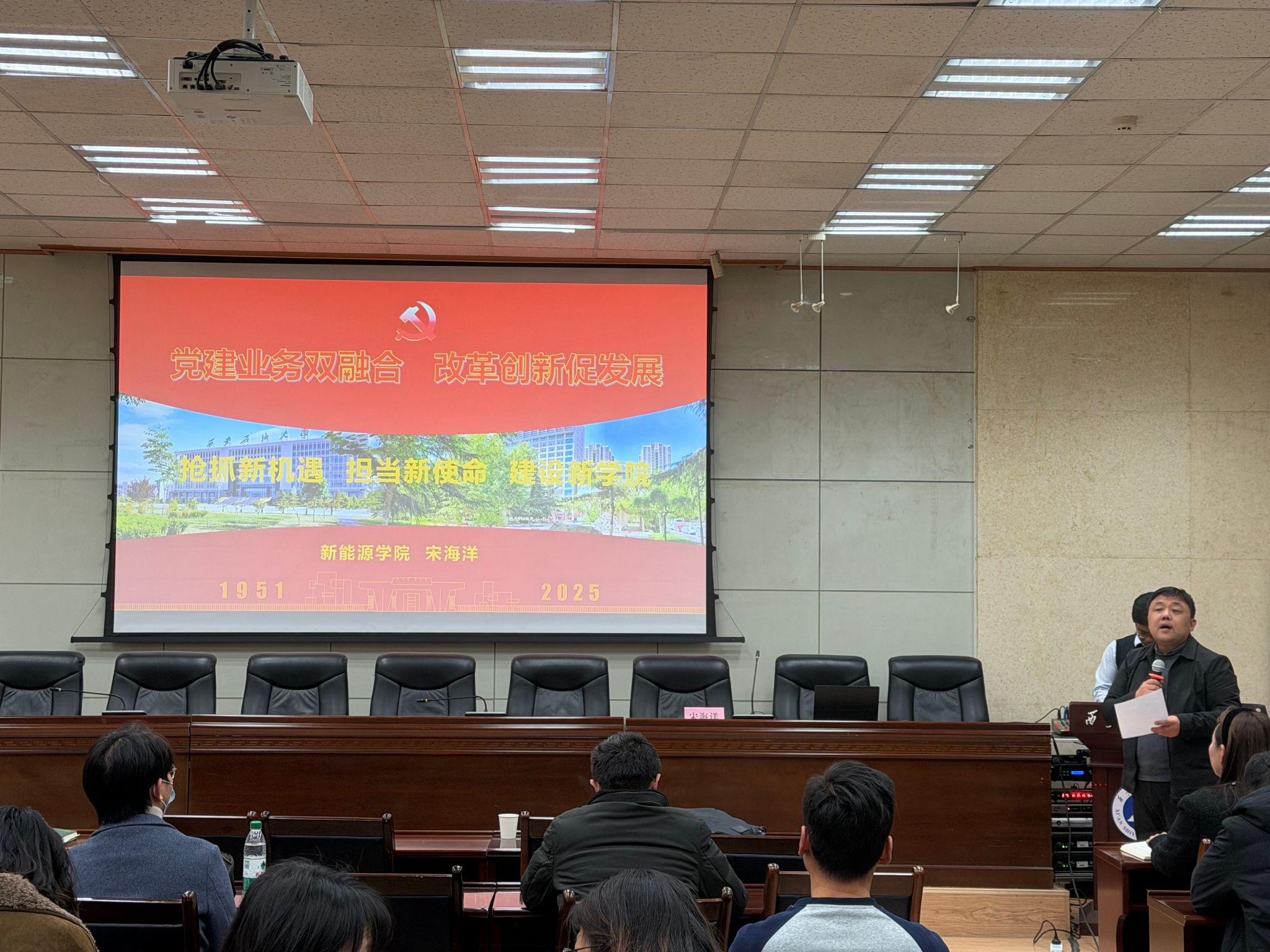 12月10日下午,管道工程學(xué)院黨委在雁塔校區(qū)西階第三會議室開展了“學(xué)黨章鑄忠誠,悟思想強使命”專題學(xué)習(xí)班第三講。本次課程由新能源學(xué)院院長宋海洋教授講授,主題為“黨建業(yè)務(wù)雙融合,改革創(chuàng)新促發(fā)展-搶抓新機遇,擔(dān)當(dāng)新使命,建設(shè)新學(xué)院”,學(xué)院全體教職工、研究生黨員代表共70余人參加學(xué)習(xí)。學(xué)習(xí)由學(xué)院黨委副書記高亮主持。