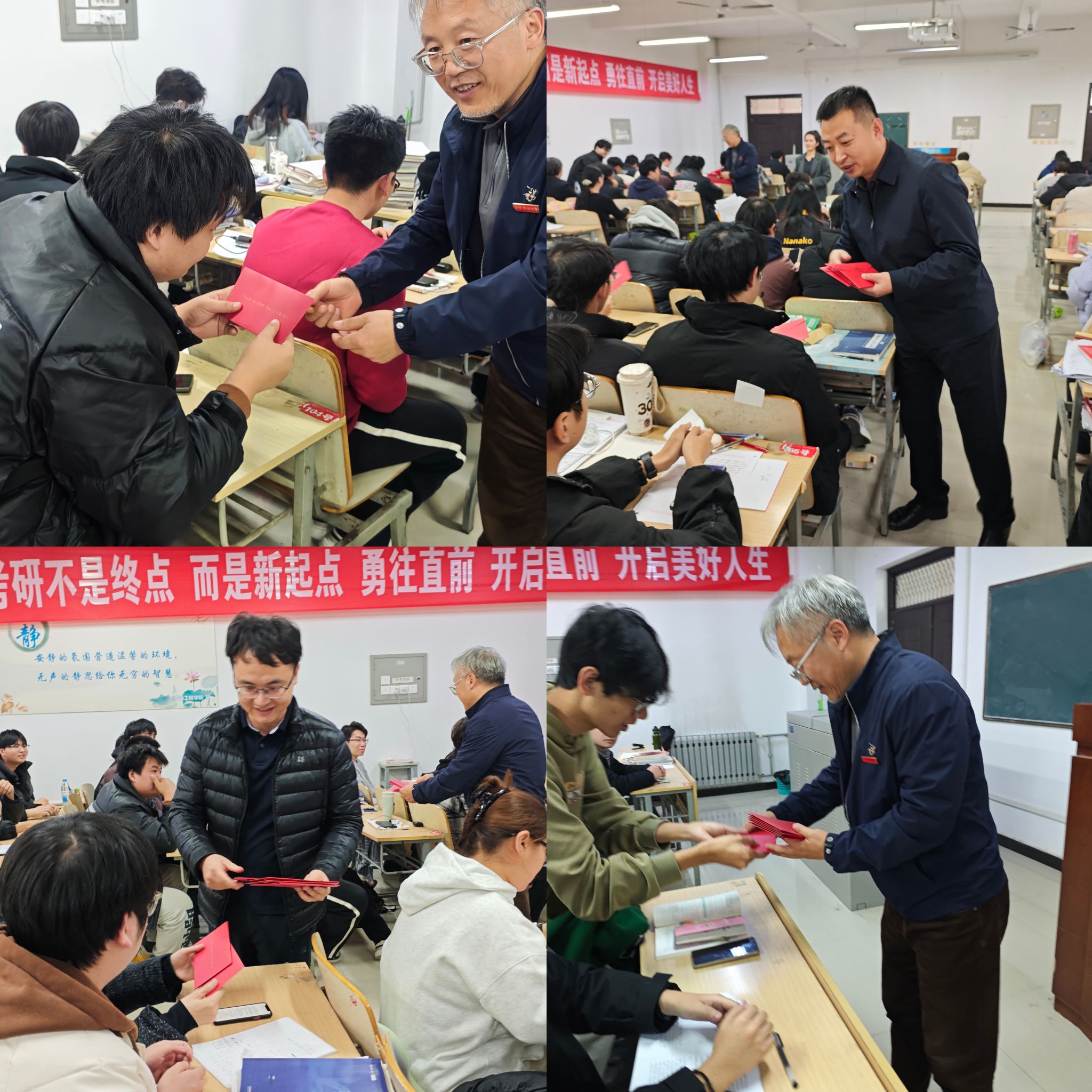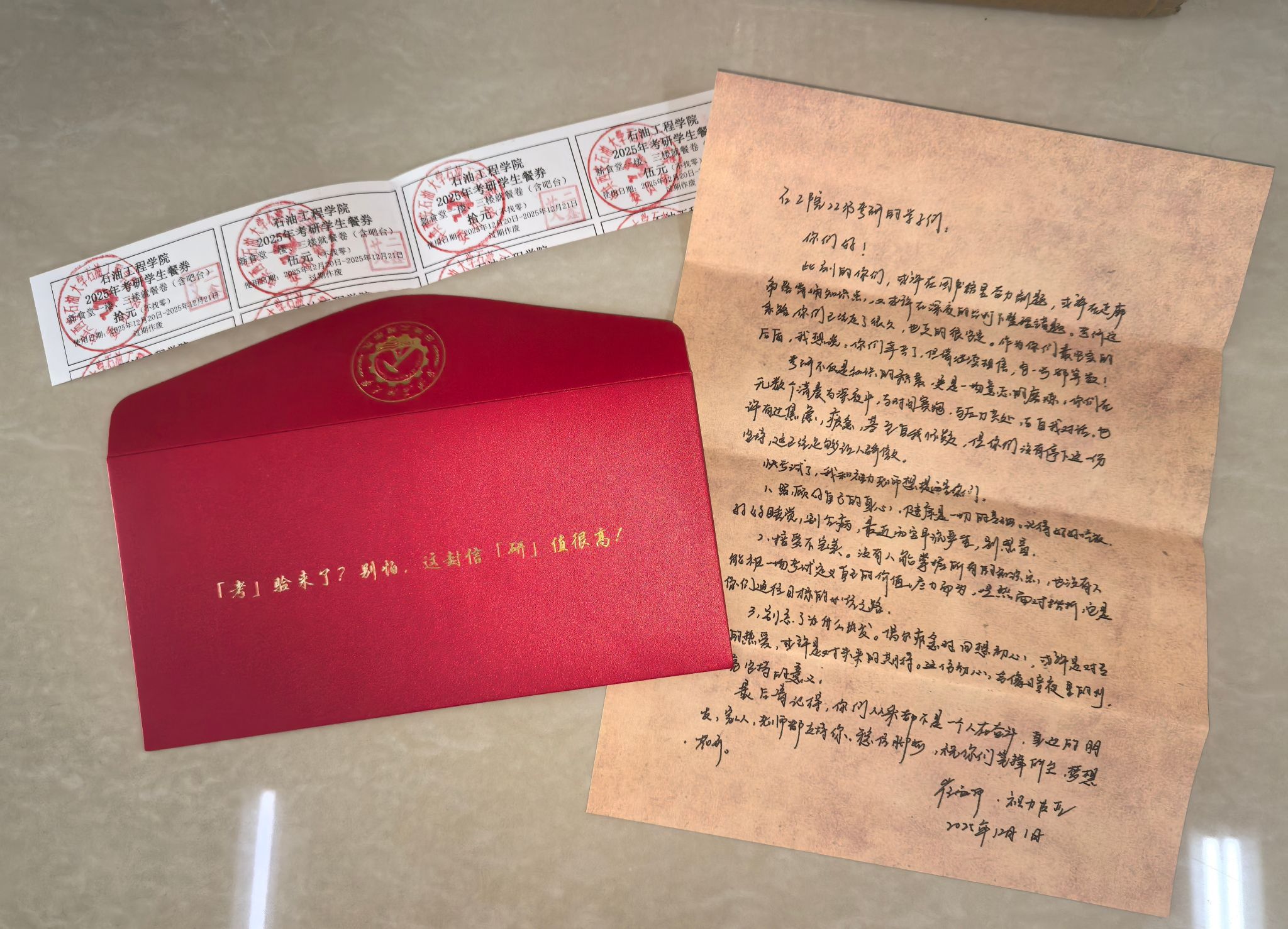 活動上,學院領(lǐng)導(dǎo)與老師們將飽含期許的禮物親手遞至備考學子手中,一封紅色信箋寄寓運當頭之祝愿,封面考研錦囊字樣凝結(jié)智慧,封口處院徽如印,靜靜烙下學院的牽掛與囑托??紤]到考試期間通訊與用餐多有不便,學院特備暖心餐票,護航學子安心落筆,尤為珍貴的是,2026屆畢業(yè)班輔導(dǎo)員為每位考生親筆書寫信函字里行間流淌真情,紙短情長蘊藏深意,讓溫暖的陪伴跨越考場內(nèi)外,成為每一位學子身后無聲卻堅實的港灣。