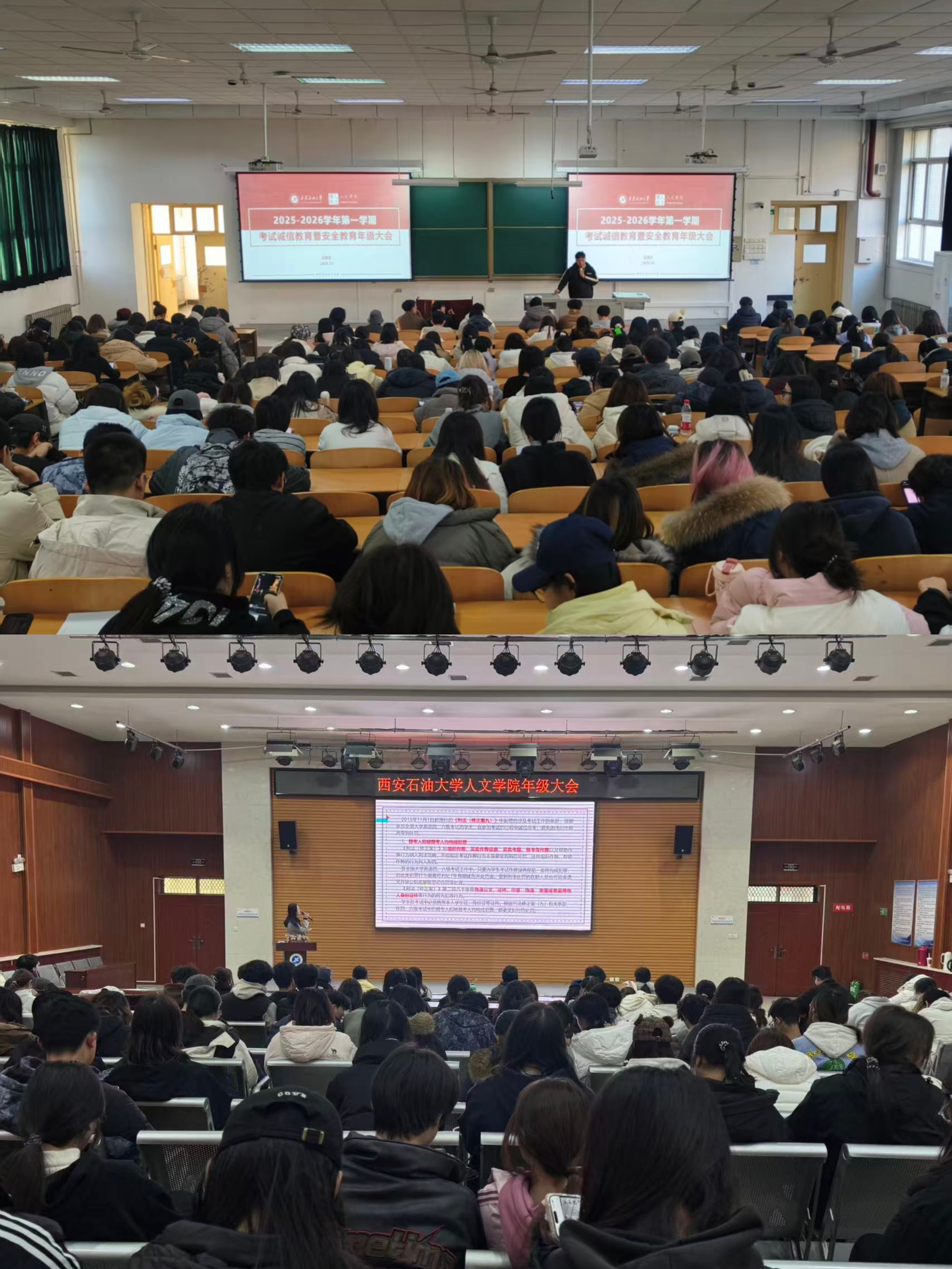 為持續(xù)強化學風建設(shè),引導學生端正學習態(tài)度,誠信應考,全面增強學生安全防范意識,營造平安、穩(wěn)定、和諧的校園環(huán)境。12月10日至11日,人文學院2023級、2024級分別在鄠邑校區(qū)博覽樓A234、崇文樓118組織召開了考風考紀暨安全教育年級大會,2023級、2024級全體本科生參會,會議由各年級輔導員主持。