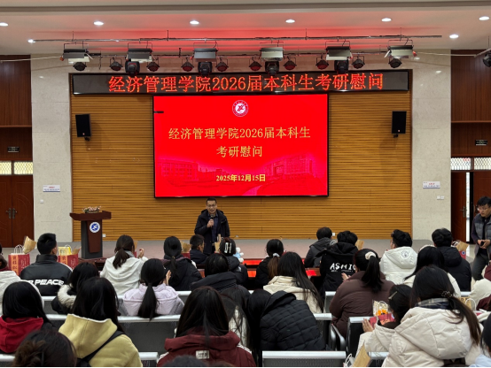 時值考研沖刺階段,為關(guān)懷備考學(xué)生,營造溫暖向上的育人氛圍,12月15日,經(jīng)濟管理學(xué)院在崇文樓118多功能廳舉行“研途送暖,‘經(jīng)’心護航”考研學(xué)子考前慰問活動。學(xué)院黨委書記張凌寒、副書記趙紀飛、副院長董春詩、李春霄,學(xué)生工作辦公室副主任張碩以及2026屆輔導(dǎo)員任仰、王業(yè)林與全體考研學(xué)子齊聚一堂,為奮戰(zhàn)在備考沖刺階段的同學(xué)們送上溫情關(guān)懷與誠摯祝福。
