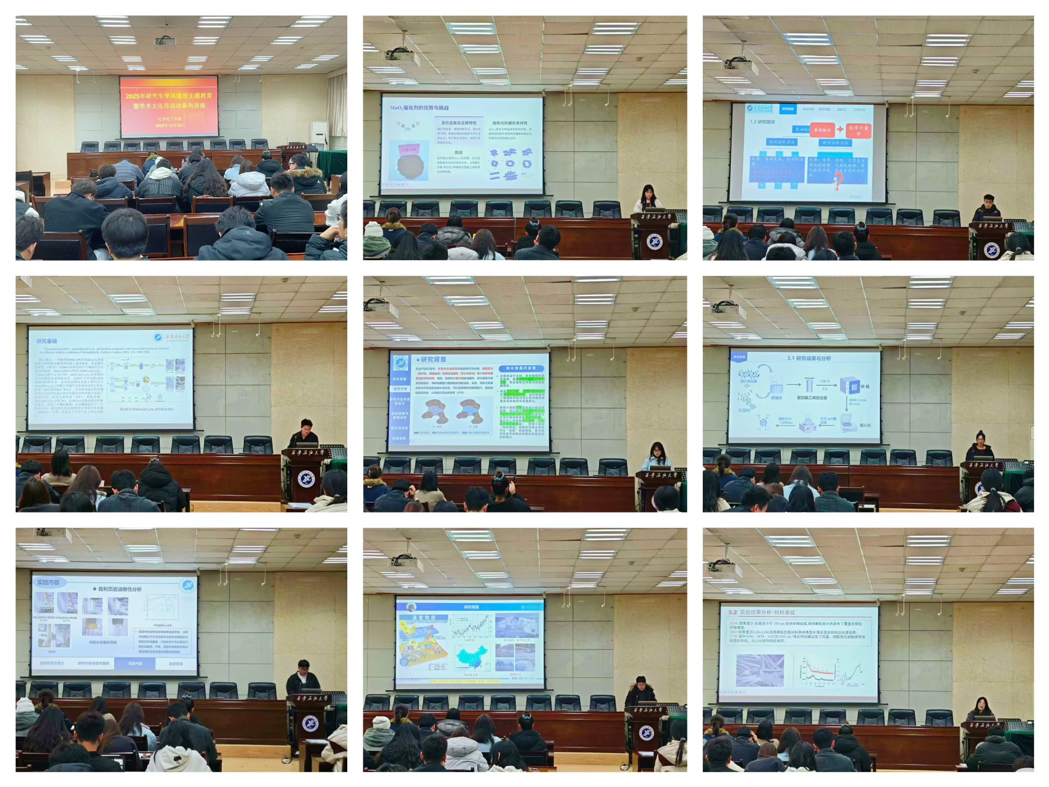 為持續(xù)強化學(xué)風(fēng)引領(lǐng),營造求真務(wù)實、開拓創(chuàng)新的學(xué)術(shù)氛圍,根據(jù)學(xué)校研究生工作部關(guān)于2025年研究生學(xué)風(fēng)建設(shè)暨學(xué)術(shù)文化活動月的安排部署,12月22日下午,化學(xué)化工學(xué)院在雁塔校區(qū)會議中心第三會議室成功舉辦2025年研究生學(xué)術(shù)文化月第二場學(xué)術(shù)報告。本場活動中,8位優(yōu)秀研究生圍繞能源催化、環(huán)境治理、功能材料等前沿領(lǐng)域作學(xué)術(shù)匯報,充分展現(xiàn)了扎實的學(xué)科素養(yǎng)與活躍的科研思維。學(xué)院專業(yè)教師于旭瑩、劉瑞,綜合辦公室秘書馮旭亮,研究生輔導(dǎo)員曹勃及各年級研究生代表參會。