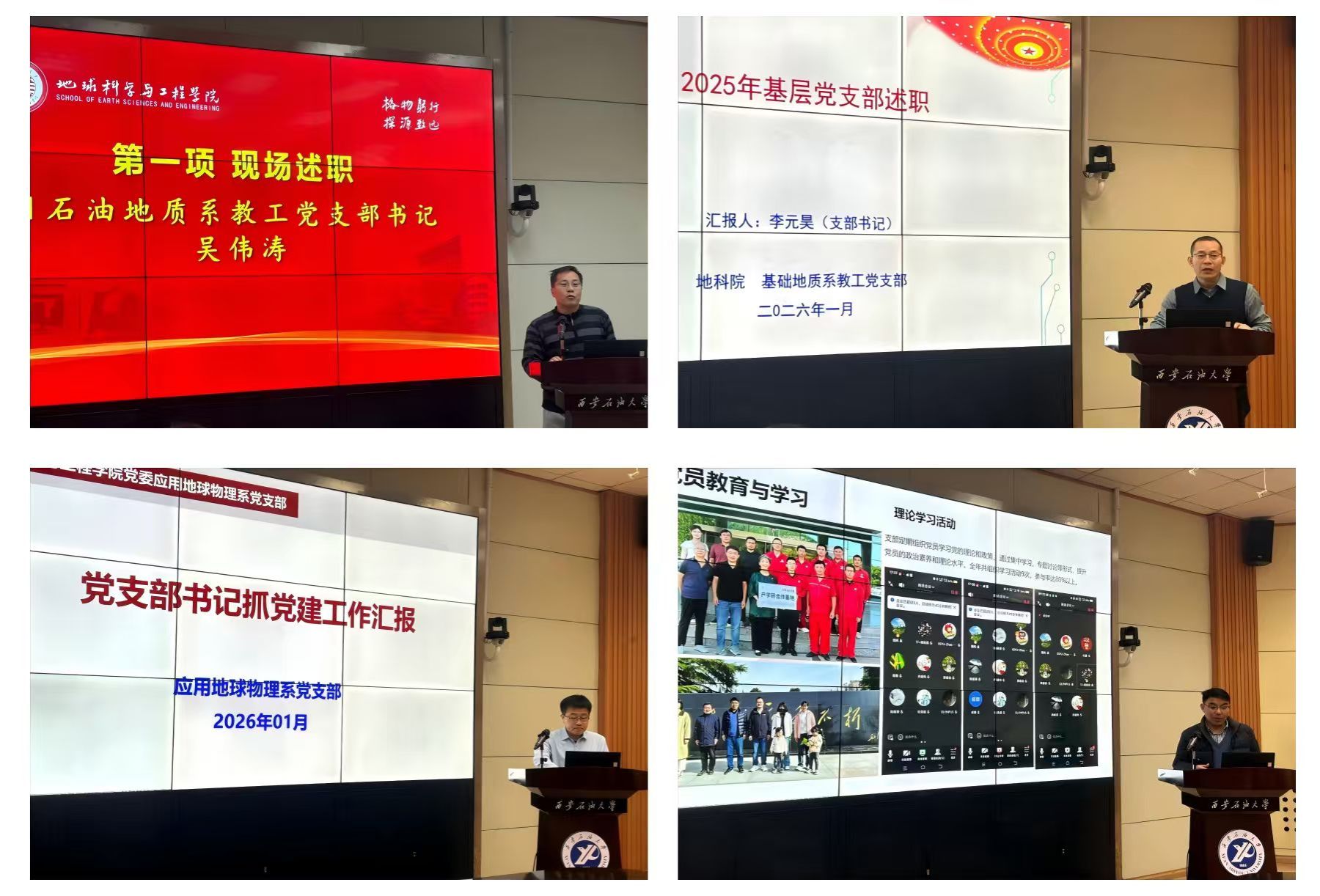 會上,石油地質(zhì)系、基礎(chǔ)地質(zhì)系、應(yīng)用地球物理系、地質(zhì)工程系4個教工黨支部書記吳偉濤、李元昊、趙軍龍、郭峰等依次進行現(xiàn)場述職。各支部書記嚴格對標履行抓基層黨建第一責(zé)任人職責(zé)要求,圍繞深入學(xué)習(xí)貫徹黨的創(chuàng)新理論、貫徹落實上級決策部署、履行全面從嚴治黨責(zé)任、落實基層黨建重點任務(wù)、推動黨建與中心工作深度融合等方面,全面匯報了一年來的工作成效,深入剖析存在問題,明確下一步改進方向和工作舉措。