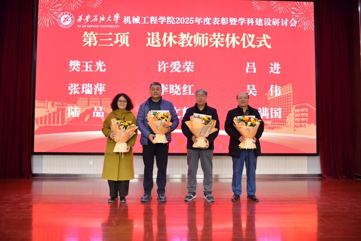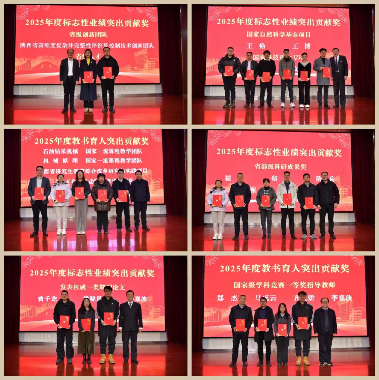 會議對2025年度在科學研究、教學改革、社會服務、學科競賽指導等方面表現(xiàn)突出的集體和個人進行了表彰。趙健副校長為省級創(chuàng)新團隊和省級人才稱號獲得者頒獎,校學術(shù)委員會副主任委員、國務院特殊津貼專家竇益華為獲批國家級項目負責人頒獎,教務處副處長陳國祥為國家一流課程教學團隊、陜西省研究生教育綜合改革研究與實踐項目團隊頒獎,科技處副處長屈樂為獲得中國商業(yè)聯(lián)合會科技進步一等獎、中國發(fā)明協(xié)會發(fā)明創(chuàng)業(yè)成果二等獎等科研成果獲獎團隊頒獎,人事處副處長張云姿為年度機械工程學院考核優(yōu)秀個人頒獎。