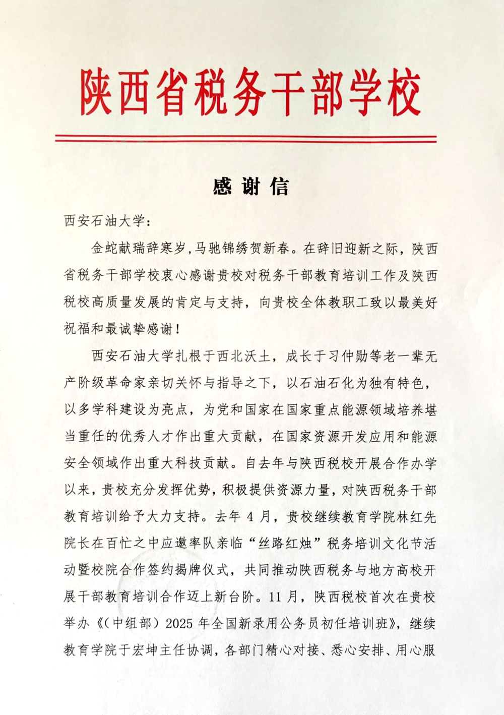 我校收到陜西省稅務(wù)干部學(xué)校發(fā)來的感謝信