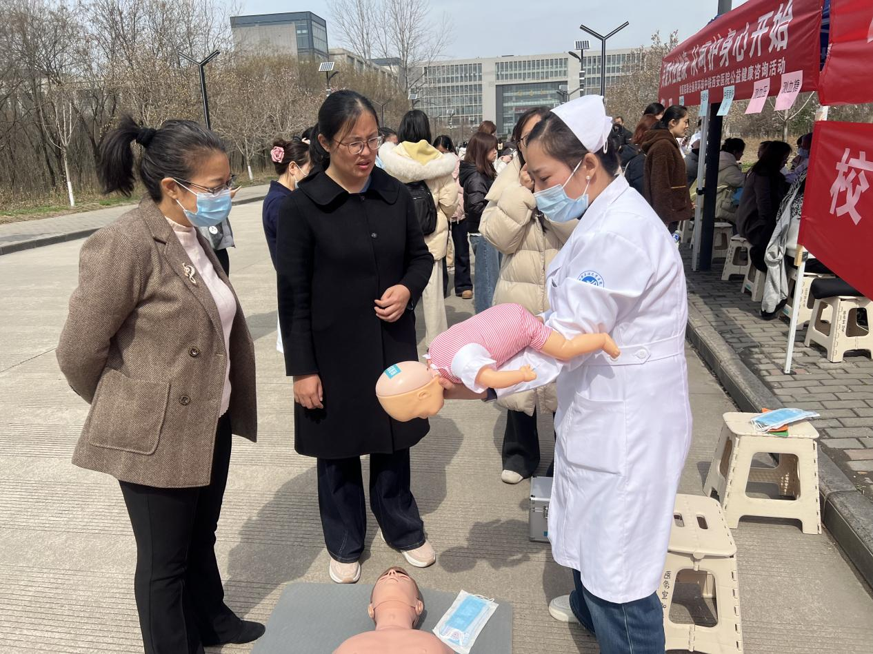 3月6日中午,鄠邑校區(qū)以“關(guān)愛女性健康,從呵護(hù)身心開始”為主題的專場健康咨詢在東區(qū)食堂對面舉行。通用環(huán)球中鐵西安醫(yī)院王娜娜、任朝偉、員海娟,及校醫(yī)院王凱、李佳晨、齊琳婧等專家組成健康咨詢團(tuán)隊(duì),提供女性常見病咨詢、中醫(yī)體質(zhì)辨識、內(nèi)分泌調(diào)理、腫瘤預(yù)防等服務(wù)?,F(xiàn)場開設(shè)血壓、血糖免費(fèi)檢測點(diǎn),校醫(yī)院急救教育團(tuán)隊(duì)聚焦校園場景普及心肺復(fù)蘇與海姆立克急救法,踐行“人人學(xué)急救,急救為人人”理念?;顒釉鲈O(shè)趣味小游戲與健康知識問答環(huán)節(jié),為參與者發(fā)放精美小禮品,現(xiàn)場氛圍溫馨熱烈、秩序井然。