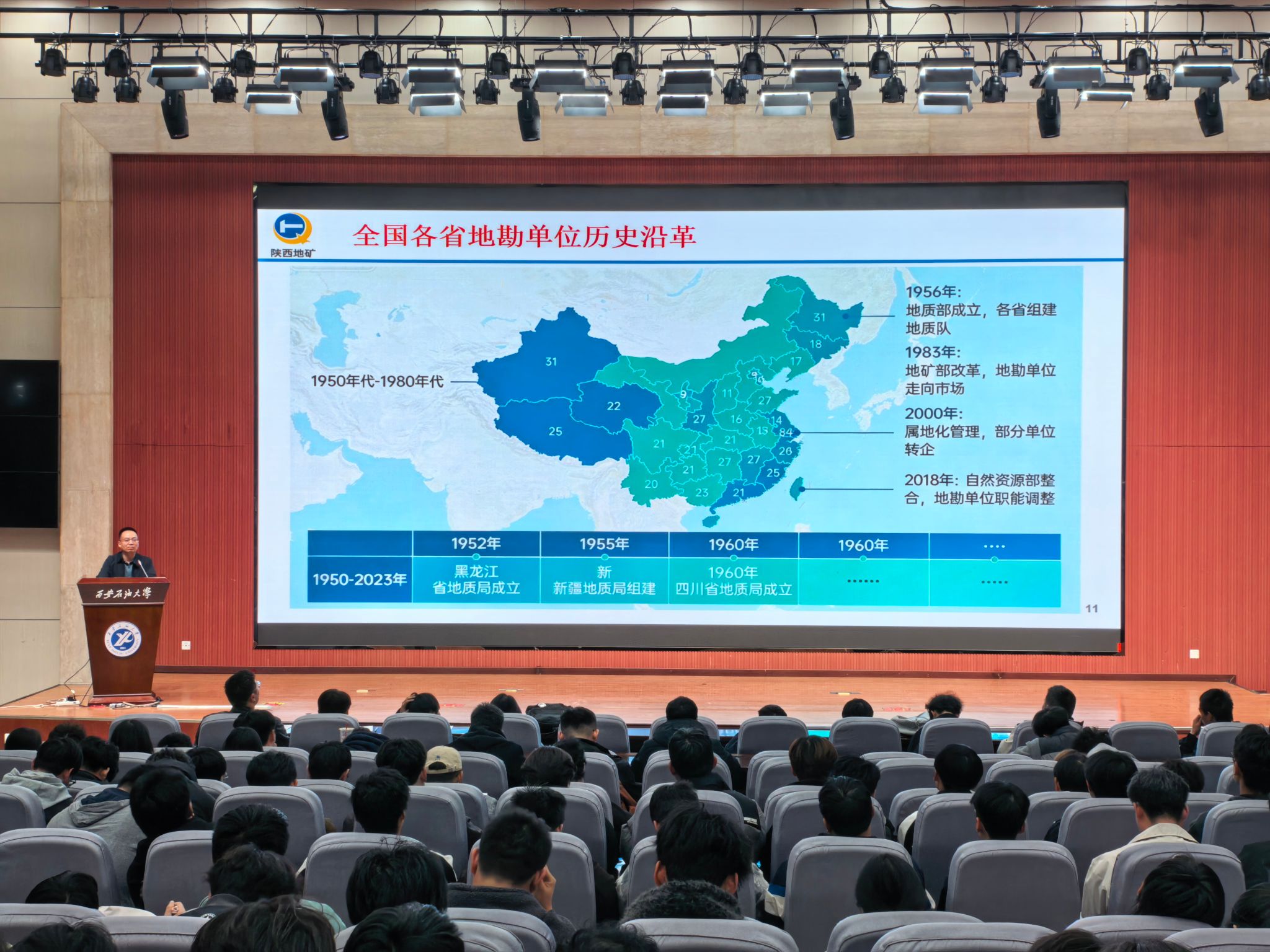 講座伊始,劉建利結(jié)合自身豐富的地質(zhì)工作經(jīng)歷和專業(yè)知識背景,系統(tǒng)梳理了地礦行業(yè)的發(fā)展歷程與當(dāng)前現(xiàn)狀。他深入淺出地分析了在全球科技革命和產(chǎn)業(yè)變革背景下,地礦行業(yè)所面臨的轉(zhuǎn)型挑戰(zhàn)與未來發(fā)展的新機(jī)遇。圍繞行業(yè)對高校人才的需求導(dǎo)向,劉建利強(qiáng)調(diào)新時(shí)代地礦人才需要著力培養(yǎng)實(shí)踐能力、團(tuán)隊(duì)協(xié)作、學(xué)習(xí)創(chuàng)新和責(zé)任擔(dān)當(dāng)?shù)暮诵乃仞B(yǎng),同時(shí)傳承和發(fā)揚(yáng)“敢擔(dān)當(dāng)、能吃苦、持之以恒”的新時(shí)代地質(zhì)人“三光榮”精神。劉建利還介紹了陜西地礦集團(tuán)的基本情況、業(yè)務(wù)領(lǐng)域以及員工培養(yǎng)體系和職業(yè)發(fā)展路徑等,尤其是我校畢業(yè)生在單位成長的典型案例,并就陜西地礦物化探隊(duì)有限公司2026屆招聘情況做了宣講。他鼓勵(lì)同學(xué)們要以優(yōu)秀的地質(zhì)前輩為榜樣,扎實(shí)學(xué)好專業(yè)知識,注重提升綜合素質(zhì),努力成長為能夠擔(dān)當(dāng)時(shí)代重任的高素質(zhì)地礦人才,為服務(wù)國家戰(zhàn)略需求和行業(yè)發(fā)展貢獻(xiàn)青春力量。