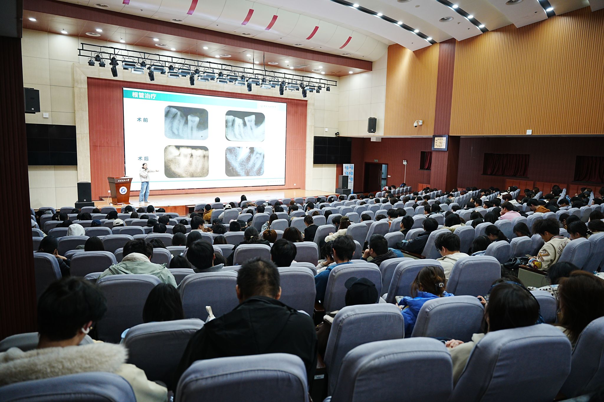 下午4時(shí),主講醫(yī)生張夢葩、朱怡玲,憑借深厚的專業(yè)素養(yǎng)和豐富的臨床經(jīng)驗(yàn),圍繞齲齒、牙周炎、智齒冠周炎等高頻問題的成因與防治進(jìn)行了深入講解,又融入日常護(hù)理實(shí)操技巧,向同學(xué)們傳授了正確刷牙、牙線使用等日常護(hù)理技巧。講座現(xiàn)場氣氛熱烈,有效提升了同學(xué)們的口腔健康素養(yǎng)。