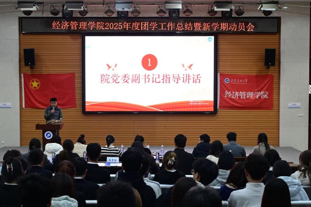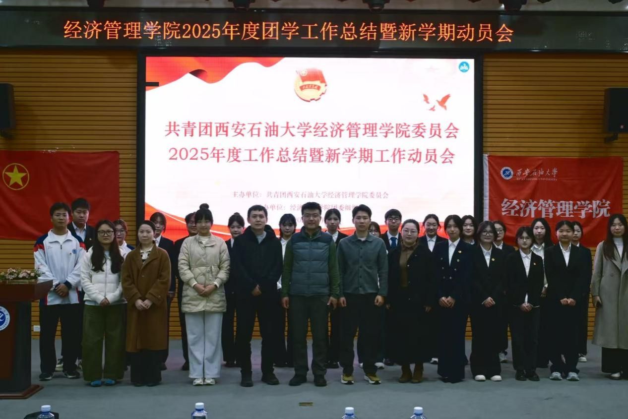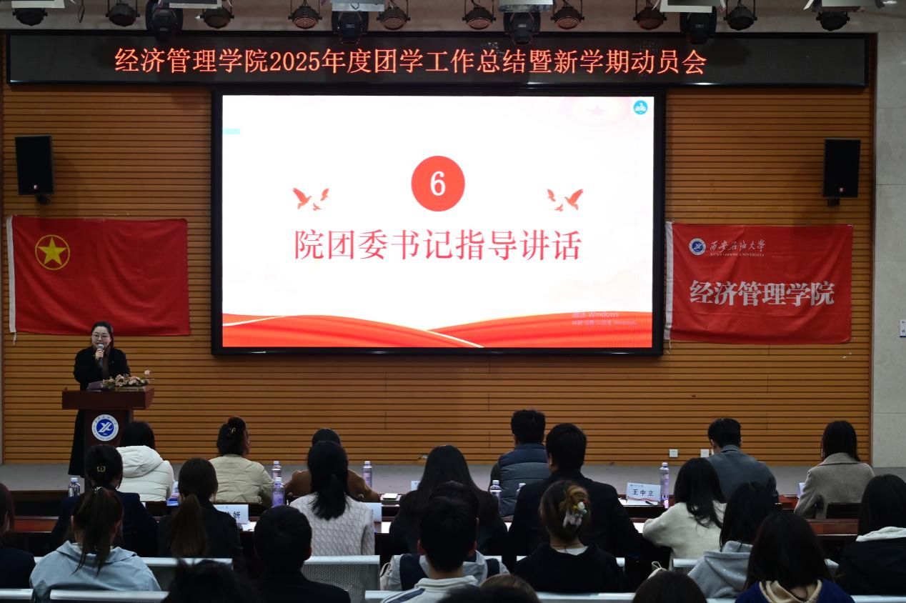 為全面總結(jié)學(xué)院2025年度團(tuán)學(xué)工作成果,凝聚奮進(jìn)力量,部署新學(xué)期工作任務(wù),西安石油大學(xué)經(jīng)濟管理學(xué)院于3月25日下午在鄠邑校區(qū)就業(yè)指導(dǎo)中心多功能廳召開2025年度團(tuán)學(xué)工作總結(jié)暨新學(xué)期工作動員大會。經(jīng)濟管理學(xué)院黨委副書記趙紀(jì)飛、院團(tuán)委書記張碩、學(xué)院專兼職輔導(dǎo)員及全體團(tuán)學(xué)干部參會。